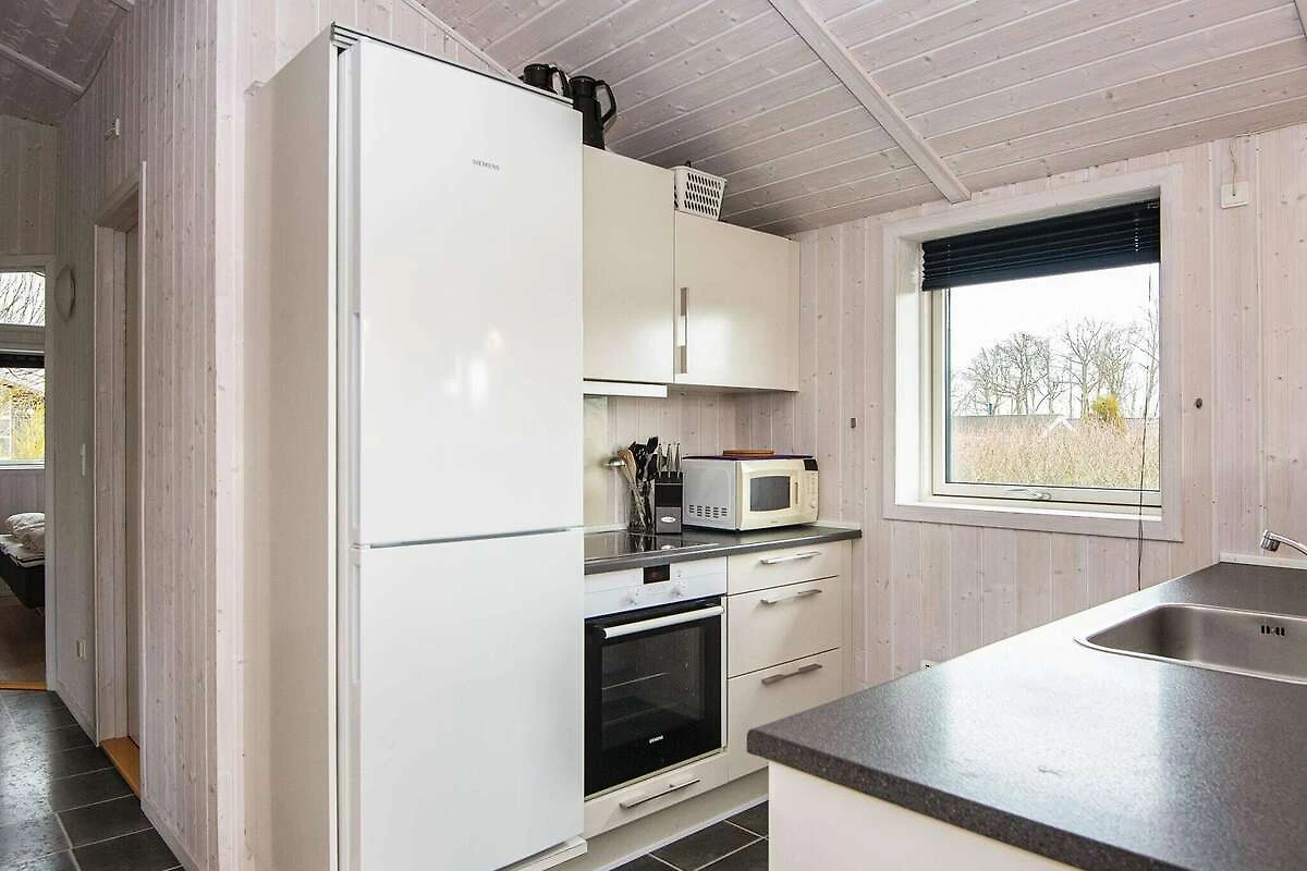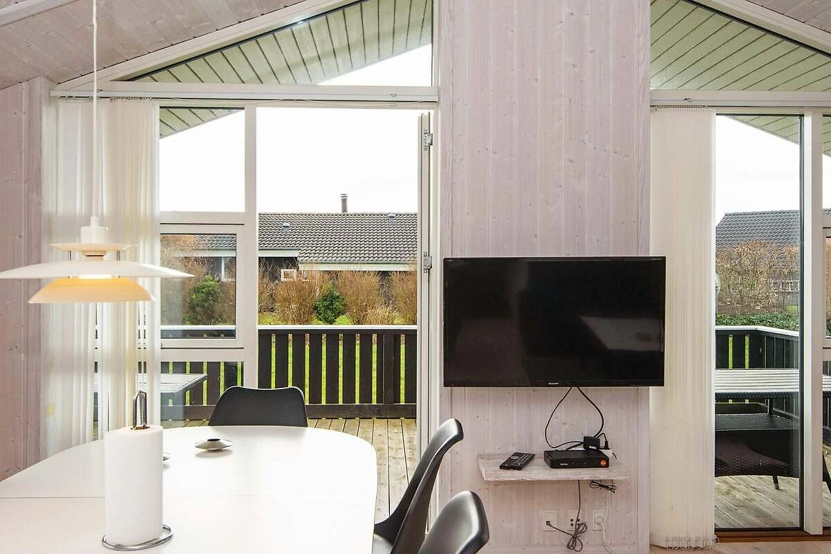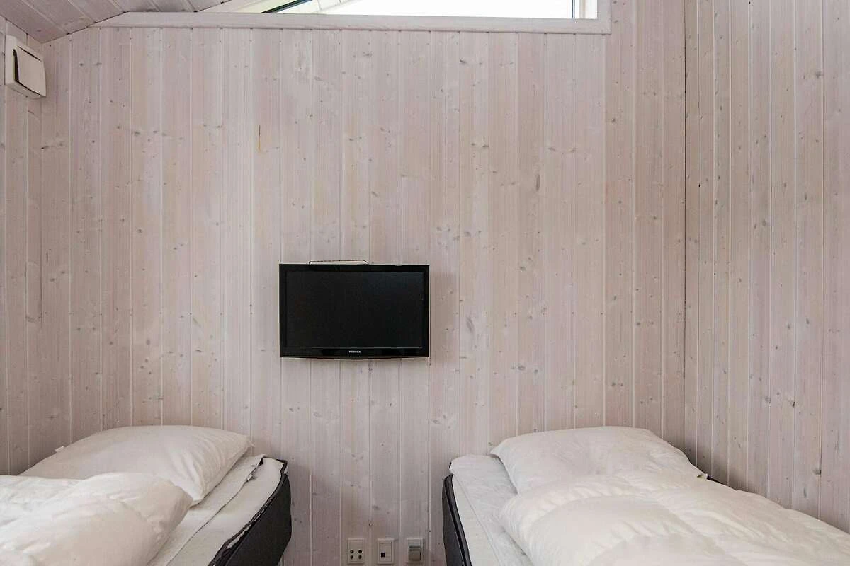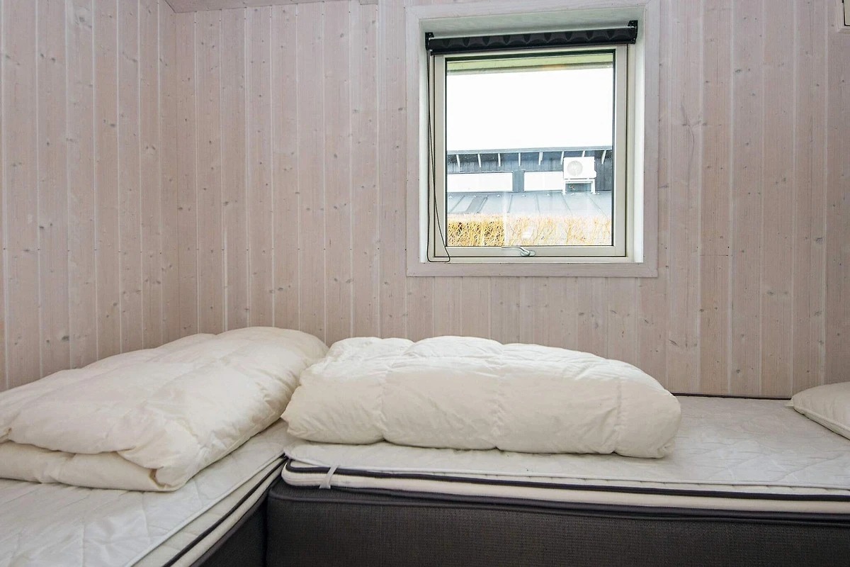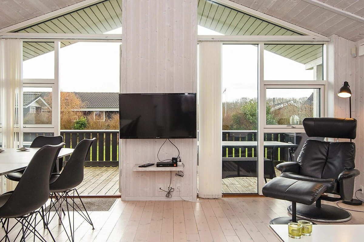 Offene Küche(Kochherd(elektrisch), Dunstabzugshaube, Kaffeemaschine, Mikrowelle, Spülmaschine, Kühl-/Gefrierkombination, Waschmaschine), Wohn-/Schlafzimmer(TV(Kabel, Deutsch Fernsehsender, dänische Fernsehsender), DVD-Spieler, Stereoanlage), Schlafzimmer(Doppelbett), Schlafzimmer(2x Einzelbett), Schlafzimmer(2x Einzelbett), Badezimmer(Fußbodenheizung)(Badewanne oder Dusche, Waschbecken, Toilette), Sauna(im Innenbereich, erwärmt, 3 Personen), Heizung(elektrisch), Terrasse, Spielgeräte, Luft-Luft-Wärmepumpe