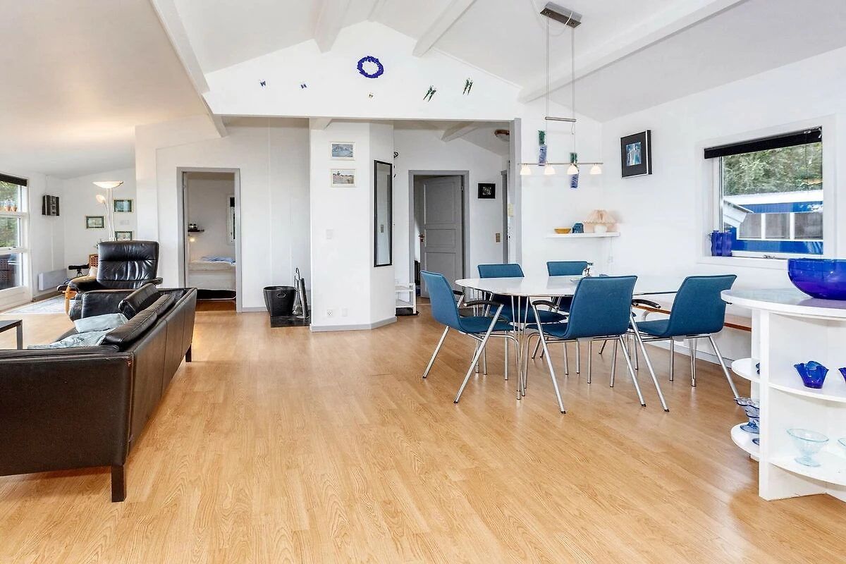 In äußerster Reihe und mit Panoramablick auf das Wasser, liegt dieses Ferienhaus auf einem Naturgrundstück. Helles Wohnzimmer mit gr. Fenstern und Ausgang zur Terrasse zum Wasser hin. Die Küche ist offen mit dem Wohnzimmer verbunden und hat einen Ausgang zur Terrasse. Das Haus ist gemütlich mit einer Kombination aus alten und neuen Möbeln eingerichtet. Die beiden Badezimmer verfügen über Dusche und Fußbodenheizung. Am Haus gibt es einen Annex mit zwei Schlafplätzen. Das Haus liegt in einem ruhigen Ferienhausgebiet mit zahlreichen kleinen Waldpfaden sowie guten Angelmöglichkeiten. Keine Vermietung an Jugendgruppen.