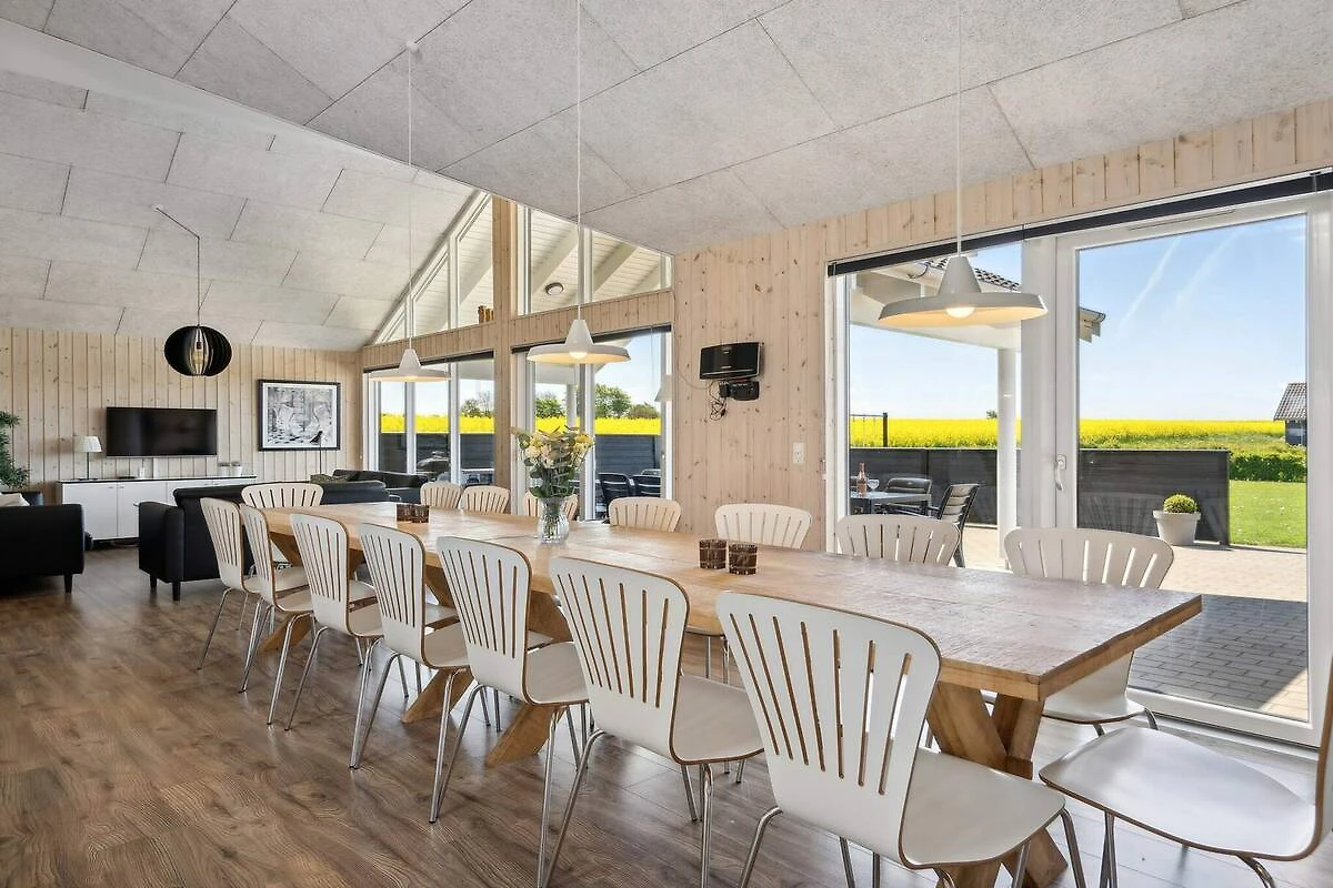 Dieses Ferienhaus liegt nur etwa 950 m vom Wasser entfernt und bietet Platz für 16 Personen. Es ist persönlich mit modernen Möbeln eingerichtet und bietet Möglichkeiten zum Entspannen oder Aktivsein. Das geräumige Haus hat eine gute Raumaufteilung: So gibt es zwei separate Schlafbereiche mit je einem Bad. Alle drei Bäder im Haus verfügen über Fußbodenheizung. Die Erwärmung erfolgt durch Erdwärme. Der Ess-Wohnraum ist geschmackvoll eingerichtet und bietet u.a. Stereoanlage, Flachbild-TV und Sofabereich. Die sechs Schlafzimmer haben Boxspringmatratzen. Darüber hinaus gibt es eine geräumige Schlafgalerie (Hems). Im Aktivitätsraum können Sie sich beim Kickern, Billard, Tischtennis oder elektronischen Dart herausfordern. Die Küche ist mit zahlreichen Hilfsmitteln ausgestattet, die man auch im Urlaub nicht missen möchte, u.a. großem Kühlschrank, zwei Öfen und zwei Spülmaschinen. Der Poolraum bietet neben dem Swimmingpool einen eingebauten Whirlpool und eine Sauna. Der Swimmingpool misst 18 m² und hat eine Gegenstromanlage und eine Rutsche für Kinder. Genießen Sie hier die Möglichkeit sowohl aktiv zu sein als auch zu Entspannen. Nach dem feuchtfröhlichen Spaß kann man es sich vor dem knisternden Feuer des Holzofens gemütlich machen. Es gibt mehrere Fernseher im Haus sowie PlayStation4 und DVD-Spieler. Im Garten steht ein Trampolin zur Verfügung (Nutzung auf eigene Gefahr). Kaution werden in bar an den Hausverwalter gezahlt.