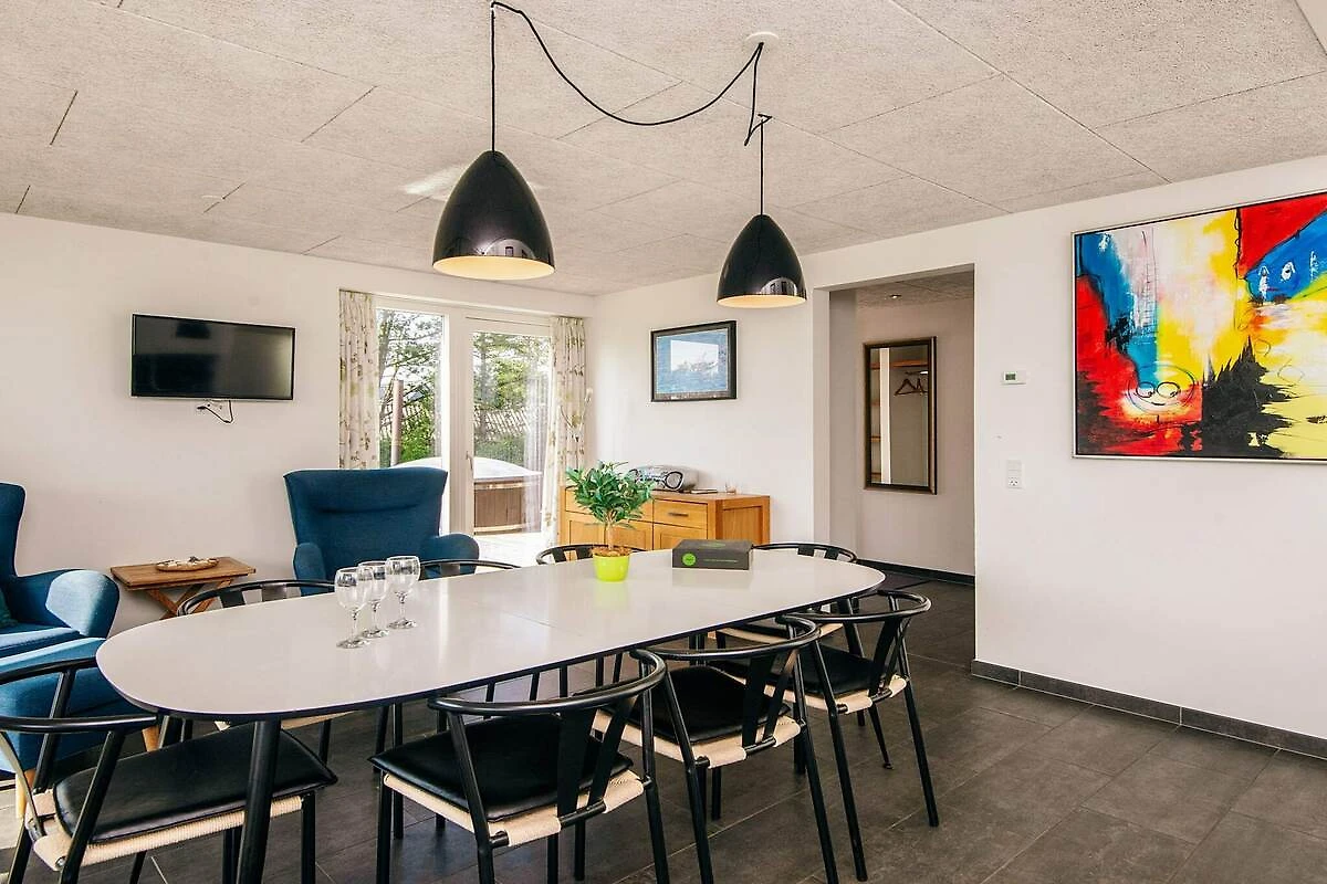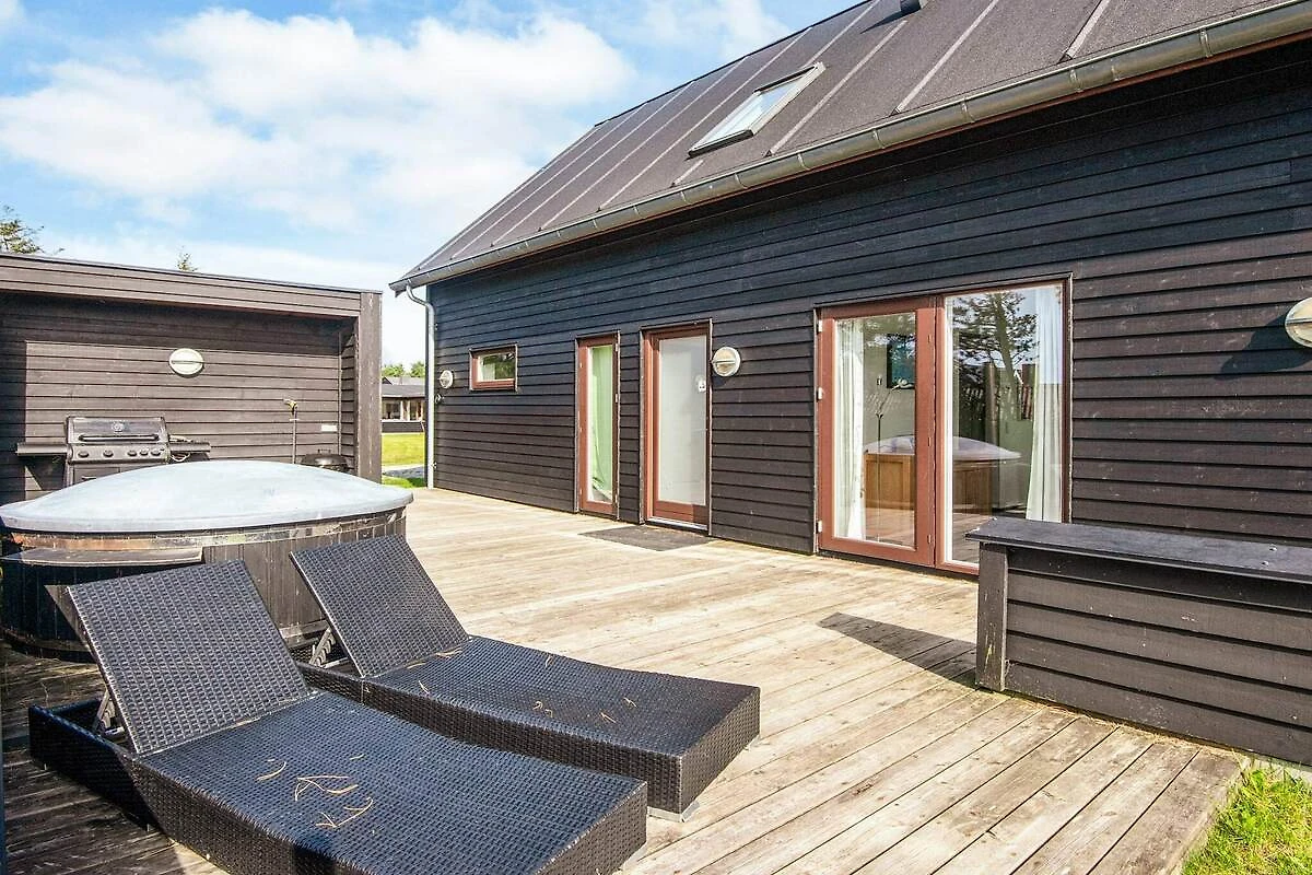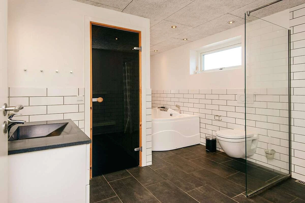 , offene Küche(Kochherd(elektrisch), Dunstabzugshaube, Kaffeemaschine, Mikrowelle, Spülmaschine, Kühl-/Gefrierkombination, Trockner, Waschmaschine), Wohn-/Schlafzimmer(TV(Kabel, Deutsch Fernsehsender, dänische Fernsehsender), Stereoanlage), Schlafzimmer(Doppelbett), Schlafzimmer(Doppelbett), Schlafzimmer(Doppelbett, Doppelklappbett ), Badezimmer(Fußbodenheizung)(Badewanne oder Dusche, Waschbecken, Toilette), Badezimmer(Fußbodenheizung)(Badewanne oder Dusche, Waschbecken, Toilette), Badewanne(im Garten), Whirlwanne(im Innenbereich, erwärmt), Sauna(im Innenbereich, erwärmt), Balkon, Terrasse, Grill