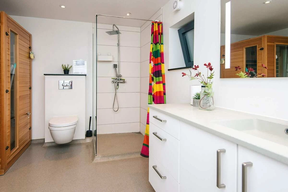 , offene Küche(Kochherd(elektrisch), Dunstabzugshaube, Kaffeemaschine, Mikrowelle, Spülmaschine, Tiefkühlschrank(> 250L), Kühl-/Gefrierkombination, Trockner, Waschmaschine), Wohn-/Schlafzimmer(Doppelklappbett , TV(Satellit), CD-Spieler, Stereoanlage), Schlafzimmer(Doppelbett), Schlafzimmer(2x Etagenbett), Badezimmer(Fußbodenheizung)(Badewanne oder Dusche, Waschbecken, Toilette), Whirlwanne(im Garten, erwärmt, 6 Personen), Sauna(im Innenbereich, erwärmt, 4 Personen), Heizung(elektrisch), Terrasse, Erdwärme