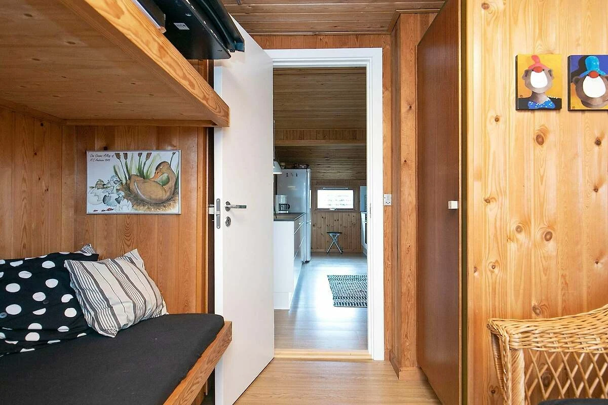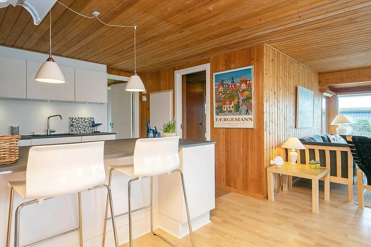 , offene Küche(Kochherd(elektrisch), Dunstabzugshaube, Kaffeemaschine, Mikrowelle, Spülmaschine, Kühl-/Gefrierkombination), Wohn-/Schlafzimmer(TV(dänische Fernsehsender), Hochstuhl), Schlafzimmer(Doppelbett, Babybett), Schlafzimmer(2x Einzelbett), Schlafzimmer(Etagenbett), Badezimmer(Fußbodenheizung)(Badewanne oder Dusche, Waschbecken, Toilette, Waschmaschine), Heizung(elektrisch), Terrasse, Grill, Luft-Luft-Wärmepumpe