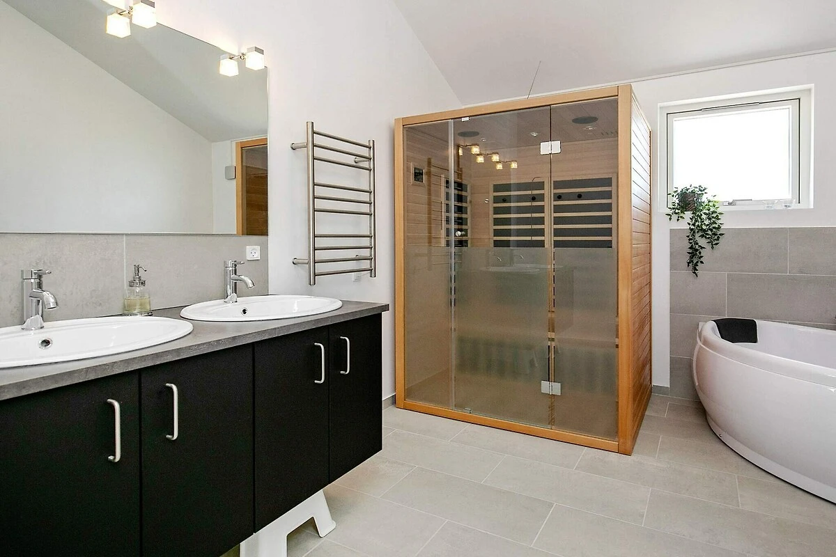 , offene Küche(Kochherd(elektrisch), Dunstabzugshaube, Kaffeemaschine, Mikrowelle, Spülmaschine, Kühl-/Gefrierkombination), Wohn-/Schlafzimmer(TV(Deutsch Fernsehsender, dänische Fernsehsender), Radio, Hochstuhl), Schlafzimmer(Doppelbett), Schlafzimmer(Doppelbett), Schlafzimmer(Doppelbett), Badezimmer(Fußbodenheizung)(Badewanne oder Dusche, Waschbecken, Toilette, Waschmaschine), Badezimmer(Fußbodenheizung)(Badewanne oder Dusche, Waschbecken, Toilette), Whirlwanne(im Innenbereich, erwärmt, 2 Personen), Sauna(im Innenbereich, erwärmt, 2 Personen), Heizung(elektrisch), Terrasse, Grill, Tischtennisplatte, Air-Hockey, Dart, Billard, Luft-Luft-Wärmepumpe