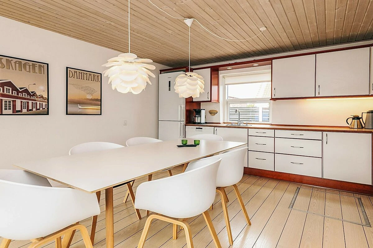Im Herzen des beliebten Ferienortes Skagen liegt dieses modern und einladend eingerichtete Ferienhaus. Sie wohnen hier nur etwa 500 m vom Ortszentrum mit seiner Fußgängerzone und wenige Autominuten von herrlichen Strandufer am Sønderstrand und Grenen entfernt, wo Sie diverse Sehenswürdigkeiten sowie eine einzigartige Küstenlandschaft erwarten. Das Ferienhaus bietet ein lichtes, offenes Ambiente in typisch skandinavischem, funktionalem Stil. Praktischer Hauswirtschaftsraum mit Fußbodenheizung, Waschmaschine und Stauraum. Großes Badezimmer mit Fußbodenheizung und Dusche/WC. Es gibt zudem vier große, helle Schlafzimmer mit Stauraum im Haus, von denen eines einen eigenen Zugang zum Grundstück hat. Außerdem gut ausgestatteter Küchen-/Aufenthaltsbereich mit Essecke und TV. Von hier aus gelangt man hinaus auf die teilweise umschlossene, geflieste Terrassenfläche. Im Haus auch helles Wohnzimmer mit gutem Mobiliar, TV und Zugang zum Außenbereich, wo ein Grill und Sitzgelegenheiten bereitstehen. Zur technischen Ausstattung gehören internationale TV-Sender sowie die Möglichkeit, Blu-ray und Chromecast zu nutzen. Für die Kleinen gibt es zwei Hochstühle und zwei Kinderbetten im Haus. Praktischer Geräteschuppen am Haus für Fahrräder usw. Keine Vermietung an Jugendgruppen erwünscht!Kurz vor Ihrem Ankunftsdatum kann eine rückzahlbare Kaution erhoben werden. Die Kaution stellt sicher, dass Ihr Aufenthalt reibungslos verläuft, und deckt eventuelle Zusatzleistungen oder Verbrauchskosten ab.Diese Kaution deckt den Verbrauch von Nebenkosten während Ihres Aufenthalts sowie zusätzliche in Anspruch genommene Leistungen ab.Der endgültige Betrag wird anhand der tatsächlichen Zählerstände und Nutzung zusätzlicher Services angepasst. Ein etwaiger Restbetrag wird Ihnen innerhalb von 21 Tagen nach dem Check-out zurückerstattet.Die Kaution dient lediglich als Vorauszahlung für Leistungen, die Sie ohnehin bezahlen würden, und ermöglicht einen reibungslosen Ablauf Ihres Aufenthalts und Check-outs.