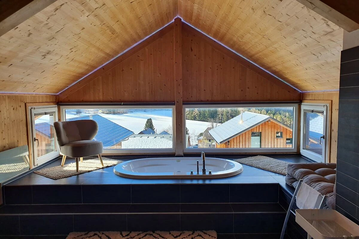 Schöne Aussicht, schönes Chalet mit schönen Terrassen. Super Badezimmer mit "Whirlpool mit Aussicht". Sehr geräumig. Wir sind hier mit 4 Personen.