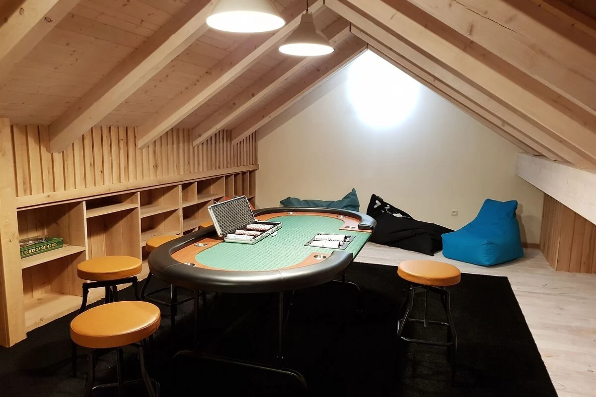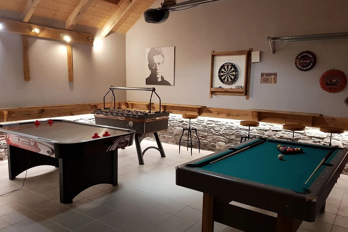 Parterre: (offene Küche(2x Einzelbett, Wasserkocher, Kochherd(Gas), Kaffeemaschine(Filter), 2x Backofen(Dampf, Grillofen), Grill, Mikrowelle, Spülmaschine, Kühl-/Gefrierkombination), Wohn/Esszimmer(TV(digital), Esstisch, Herd(Holz)), Schlafzimmer mit Badezimmer(2x Einzelbett, Dusche(angepasst für Behinderte), Waschbecken, Toilette), Toilette(Waschbecken, Toilette), Waschraum(Trockner), Freizeitraum(Tischtennisplatte, Tischfußball, Air-Hockey, Dart, Billard), Terrasse)