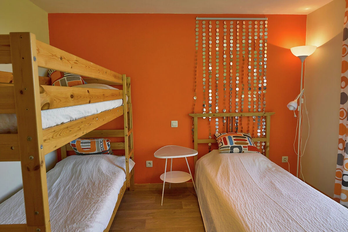 Parterre: (Eingangshalle, Aufenthaltsraum(8 Personen)(TV, Kaminofen, Radio, CD-Spieler), offene Küche(Esstisch(9 Personen), Kochherd(Ceranfeld), Kaffeemaschine(Filter, pads), Backofen(Grillofen), Mikrowelle, Spülmaschine, Kühlschrank(+ Gefrierfach), Hochstuhl), Schlafzimmer mit Badezimmer(2x Einzelbett, Dusche, Waschbecken), Toilette)