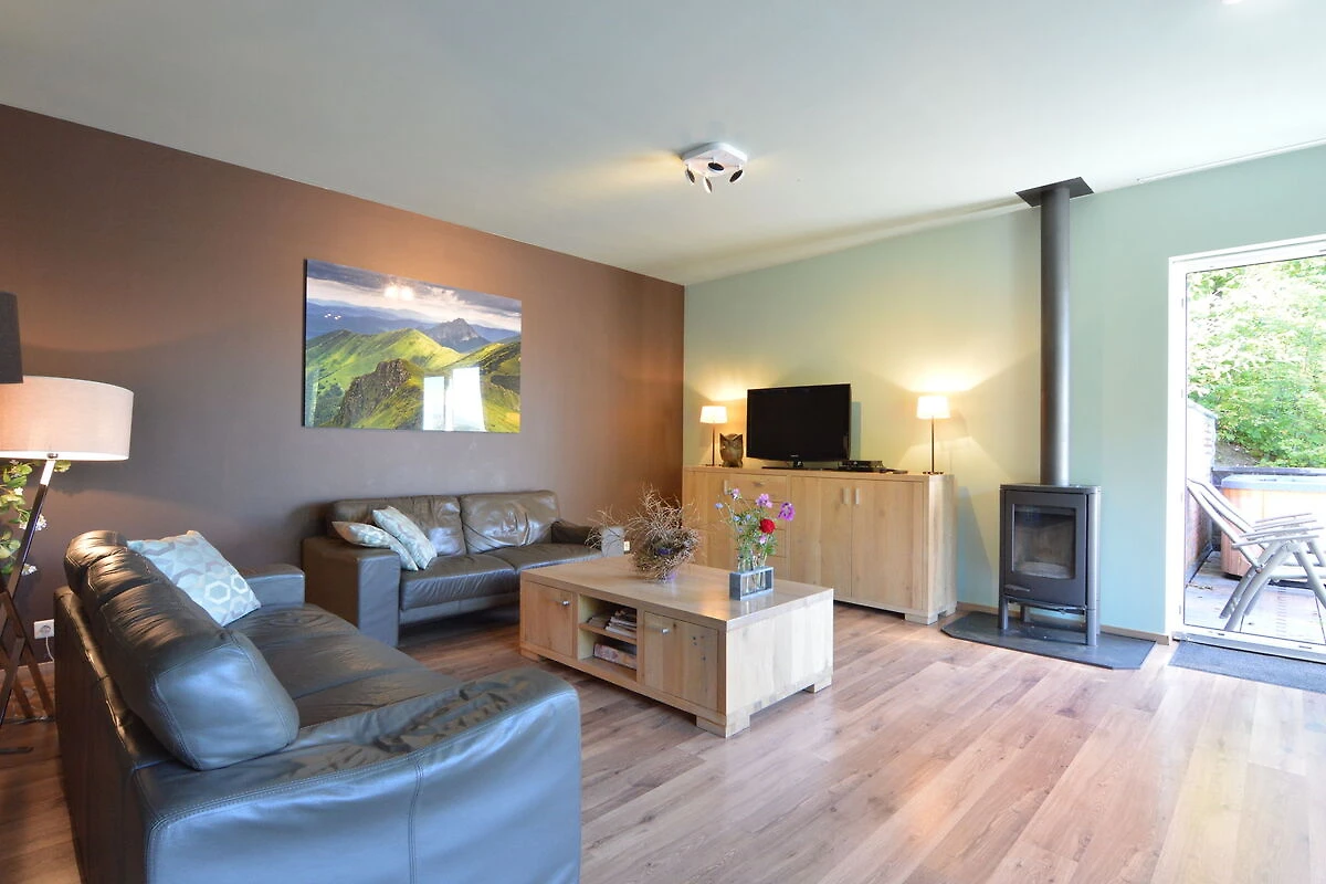 In der 1. Etage: (Wohnzimmer(TV(Flatscreen, smart TV, internationale TV-Kanäle), Herd(Holz), Sitzecke, CD-Spieler), Esszimmer(Esstisch), offene Küche(Esstisch, Radio, Toaster, Kochherd(4 Kochplatten, Ceranfeld), Kaffeemaschine(Filter, pads), Backofen, Mikrowelle, Spülmaschine, Kühlschrank(+ Gefrierfach), Hochstuhl), Toilette, Terrasse(50 m2))