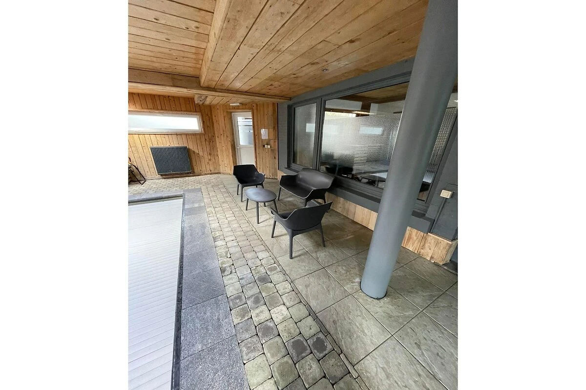 Terrasse(umzäunt), Garten(alleinige Nutzung, umzäunt), Gartenmöbel, Grill, 6x Parkplatz, Pool(alleinige Nutzung, erwärmt, überdacht, 7 x 4 m.), 2x Boulebahn, Tischtennisplatte, Kinderbett, Hochstuhl