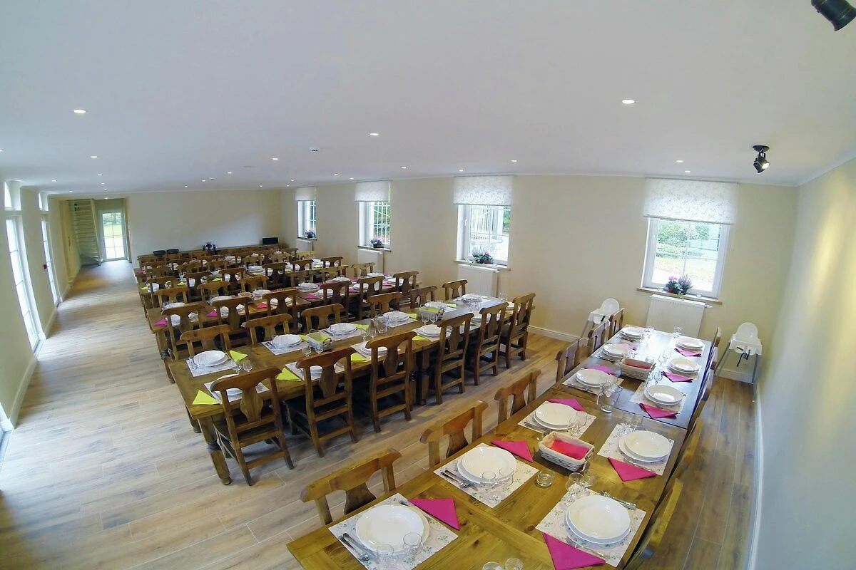 Die voll ausgestattete Küche mit Cerankochfeld, Mikrowelle, Geschirrspüler und Kühl-Gefrierkombination eignet sich ideal für die Zubereitung von Mahlzeiten für große Gruppen. Die Schlafzimmer auf den Etagen verfügen über Einzelbetten und Doppelschlafsofas sowie verschiedene moderne Badezimmer und Toiletten für zusätzlichen Komfort. Draußen lädt ein eingezäunter Privatgarten mit Gartenbänken und einem großen Grill zum Entspannen oder Essen im Freien ein. Ausreichend Parkplätze runden die Unterkunft ab.