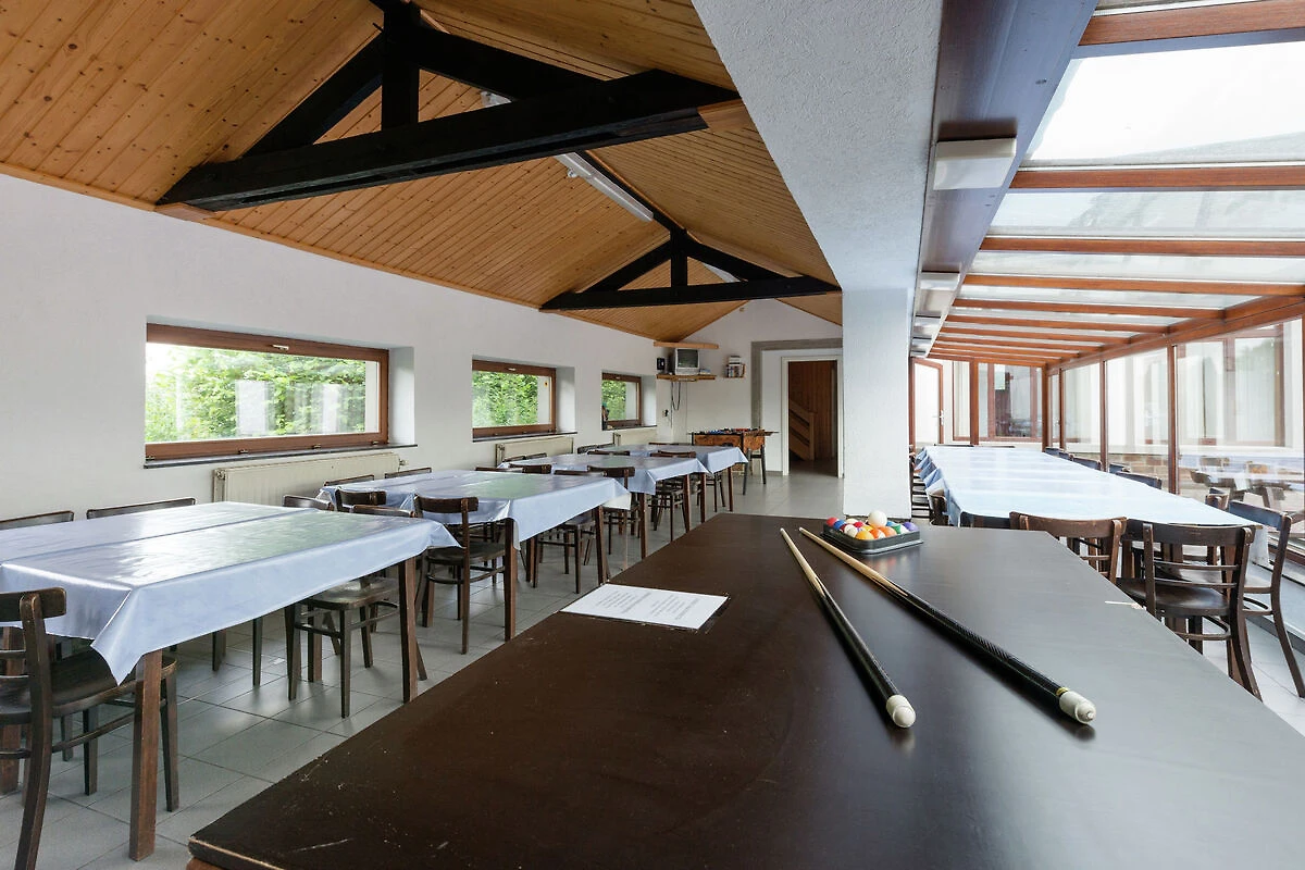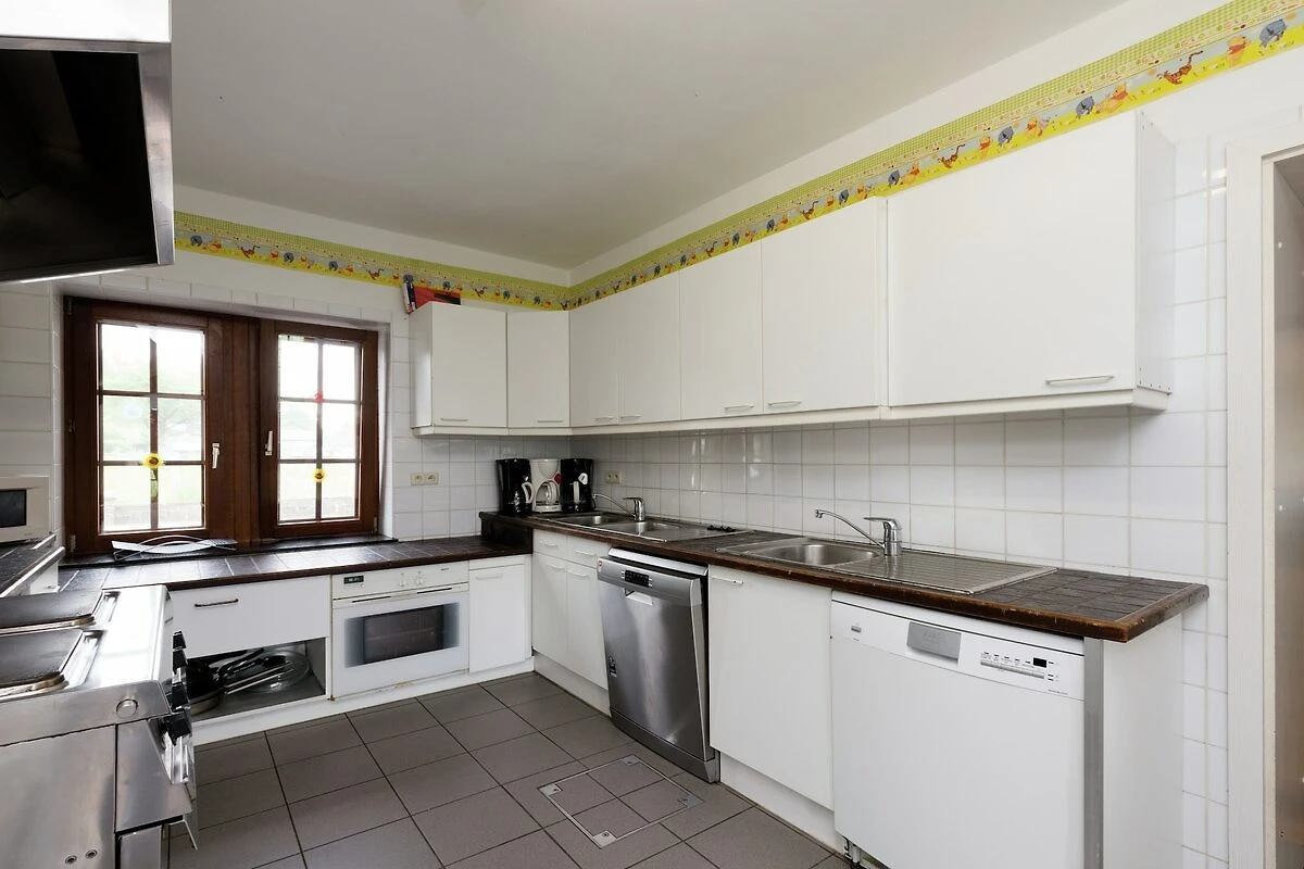 In der ehemaligen Dorfschule von Deiffelt in den Luxemburger Ardennen entstand dieses große Ferienhaus mit 11 Schlafzimmern und mehreren Bädern, in dem Gruppen bis zu 50 Personen Platz finden. Eine große, sehr gut ausgestattete Küche erleichtert die Selbstverpflegung, für gemeinsame Aktivitäten stehen ein großer Aufenthaltsraum mit Bar sowie ein Esszimmer zur Verfügung. Entspannung finden die Urlauber in der Sauna, im Whirlpool oder auf der Sonnenbank, für die aktiven Gäste gibt es einen Billardtisch und einen Kicker. Der Garten, in dem sich auch einige Kinderspielgeräte befinden, ist groß genug zum Fußballspielen. Weitere sportliche Aktivitäten wie Wander-, Rad- und Skiktouren durch das riesige Waldgebiet der Umgebung können direkt ab der Unterkunft gestartet werden. In den nahegelegenen Flüssen ist auch Kajakfahren oder Angeln möglich.
