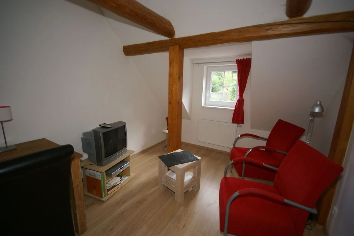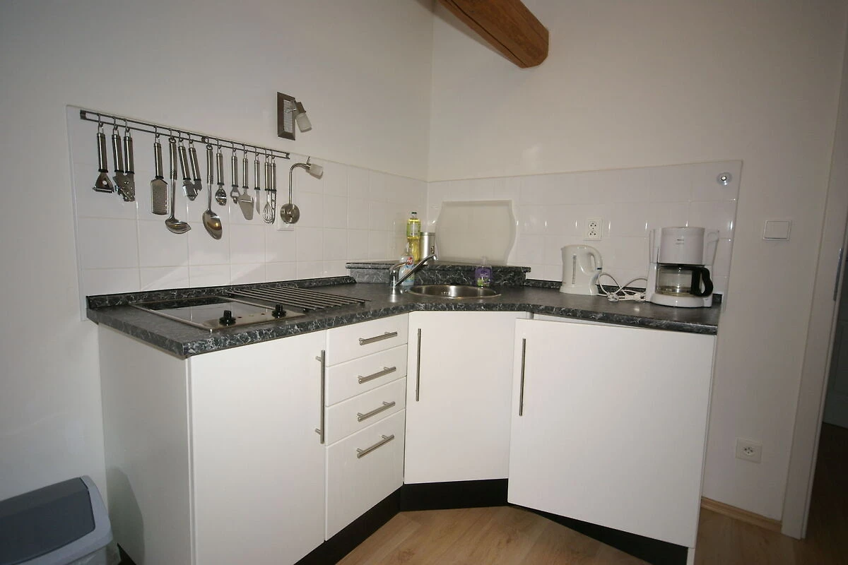 In der 1. Etage: (Eingangshalle, Wohnzimmer(TV(Satellit)), offene Küche(Kochherd(2 Kochplatten, Ceranfeld)), Schlafzimmer(2x Einzelbett), Badezimmer(Dusche, Waschbecken, Toilette))