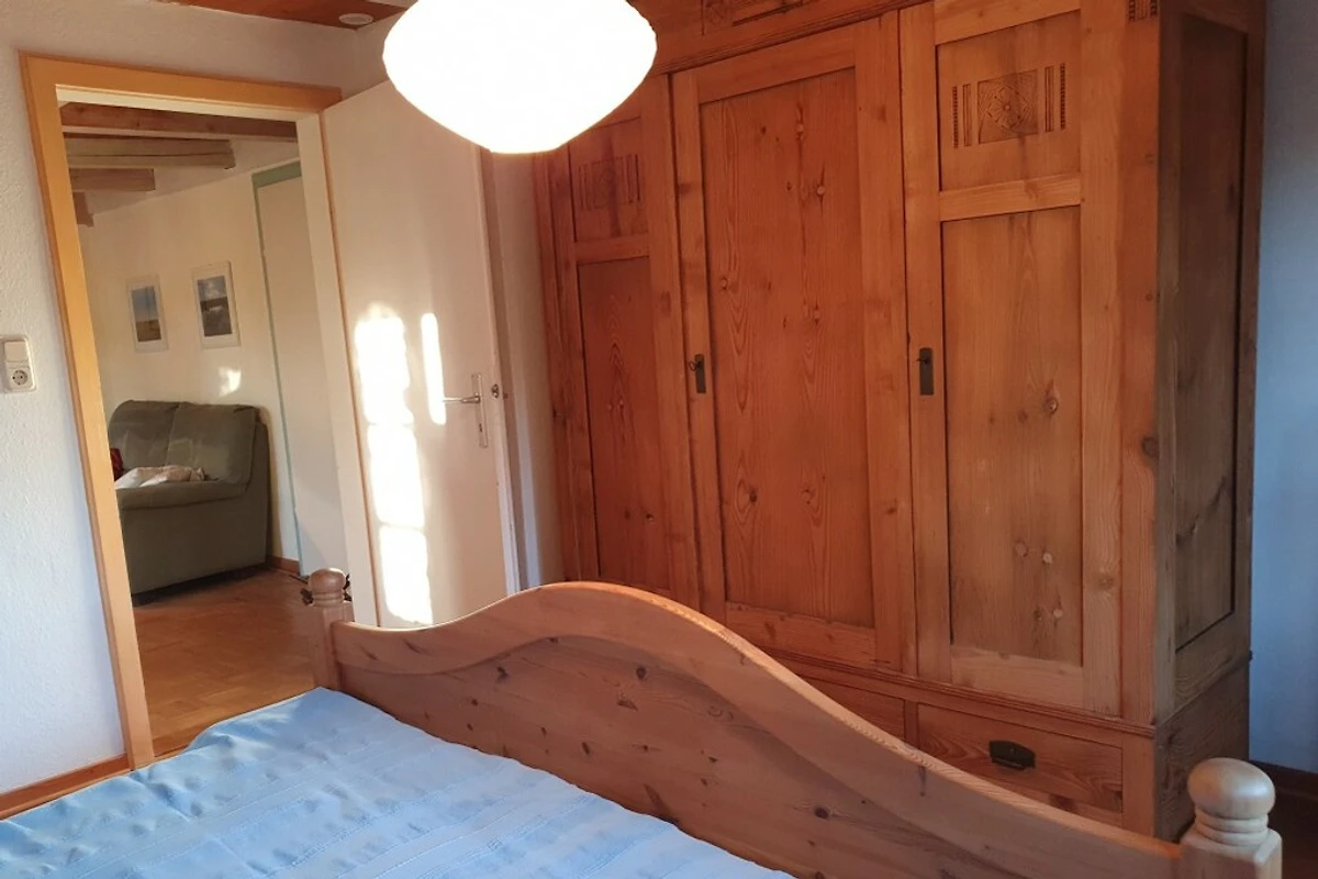 - Schlafzimmer mit Korkfußboden, Doppelbett und bei Bedarf Kinderbett