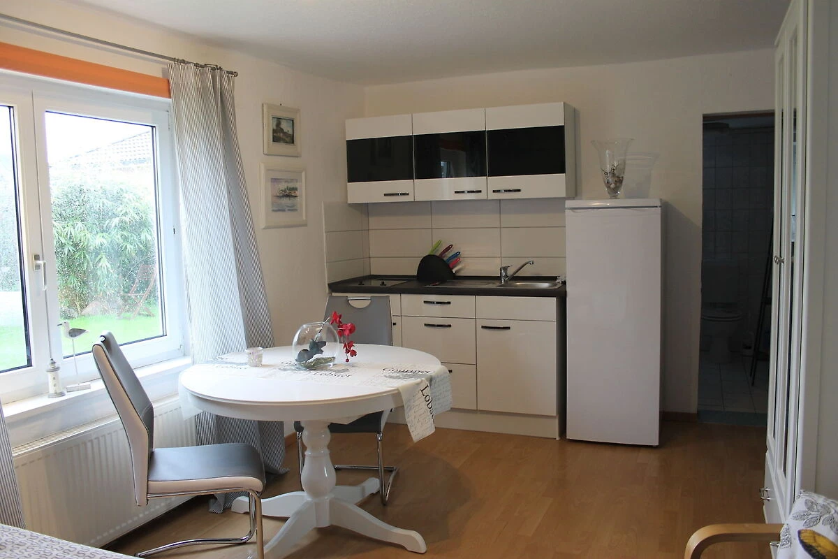 Parterre: (Eingangshalle(Gemeinschaftliche Nutzung mit dem Eigentümer), Kochnische(Toaster, Kochherd(4 Kochplatten, Ceranfeld), Kaffeemaschine, Mikrowelle, Kühlschrank(+ Gefrierfach)), Wohn-/Schlafzimmer(Doppelbett king size(160 x 200 cm), TV(Flatscreen), Esstisch(4 Personen), Sitzecke, DVD-Spieler, Radio, CD-Spieler), Schlafzimmer(Etagenbett), Badezimmer(Dusche, Waschbecken, Toilette), Heizung)
