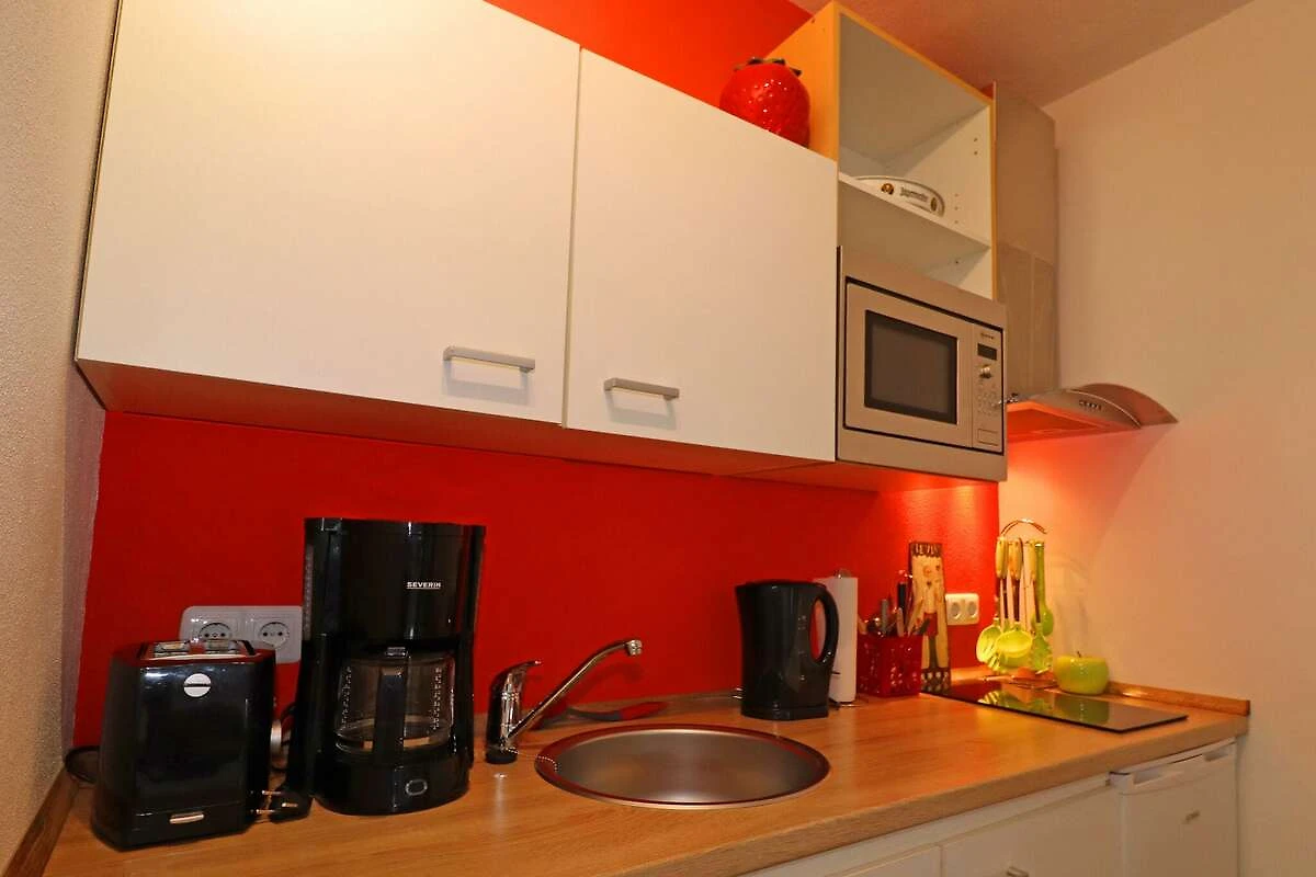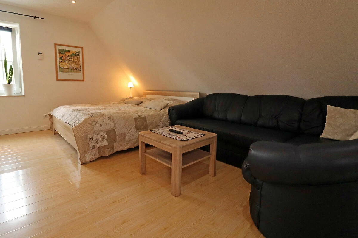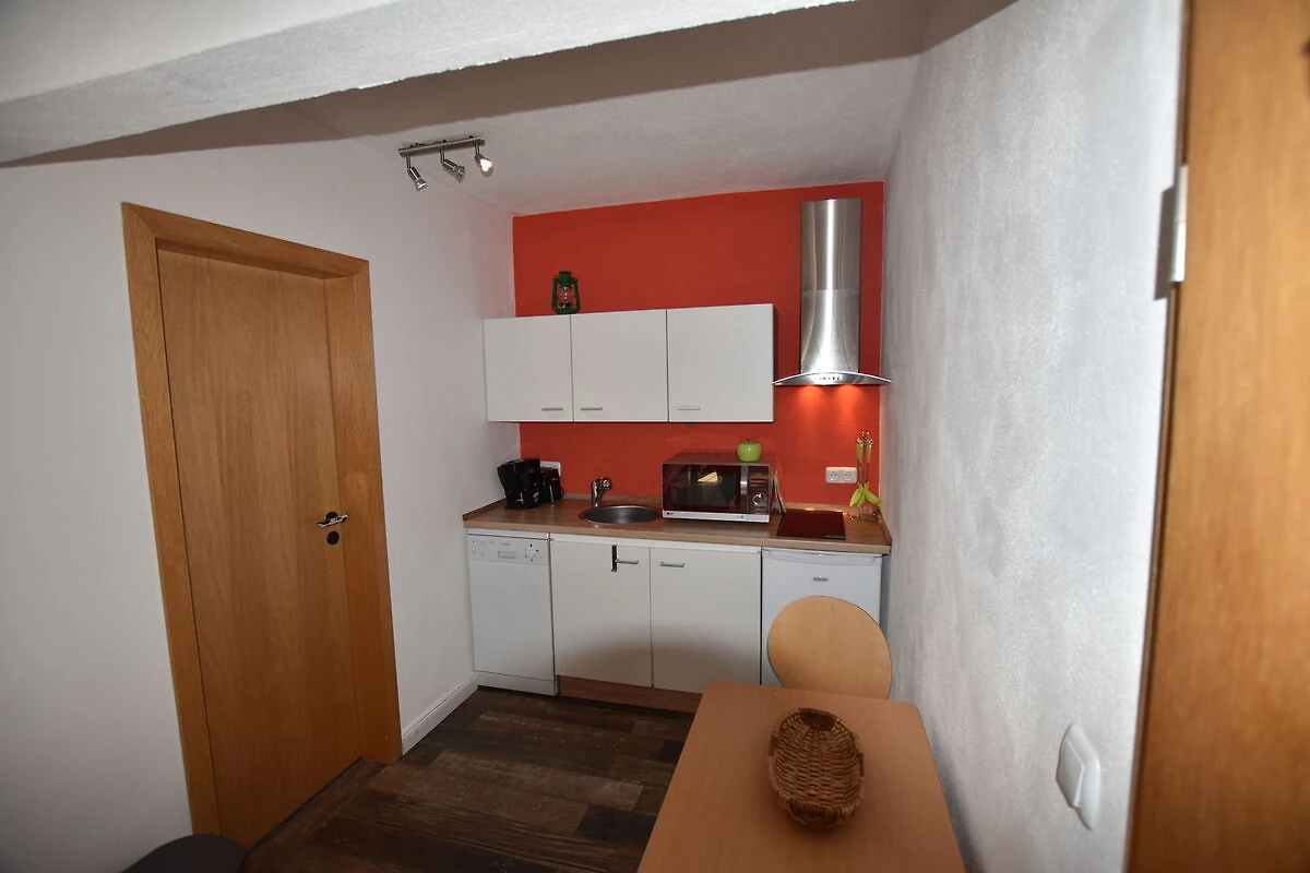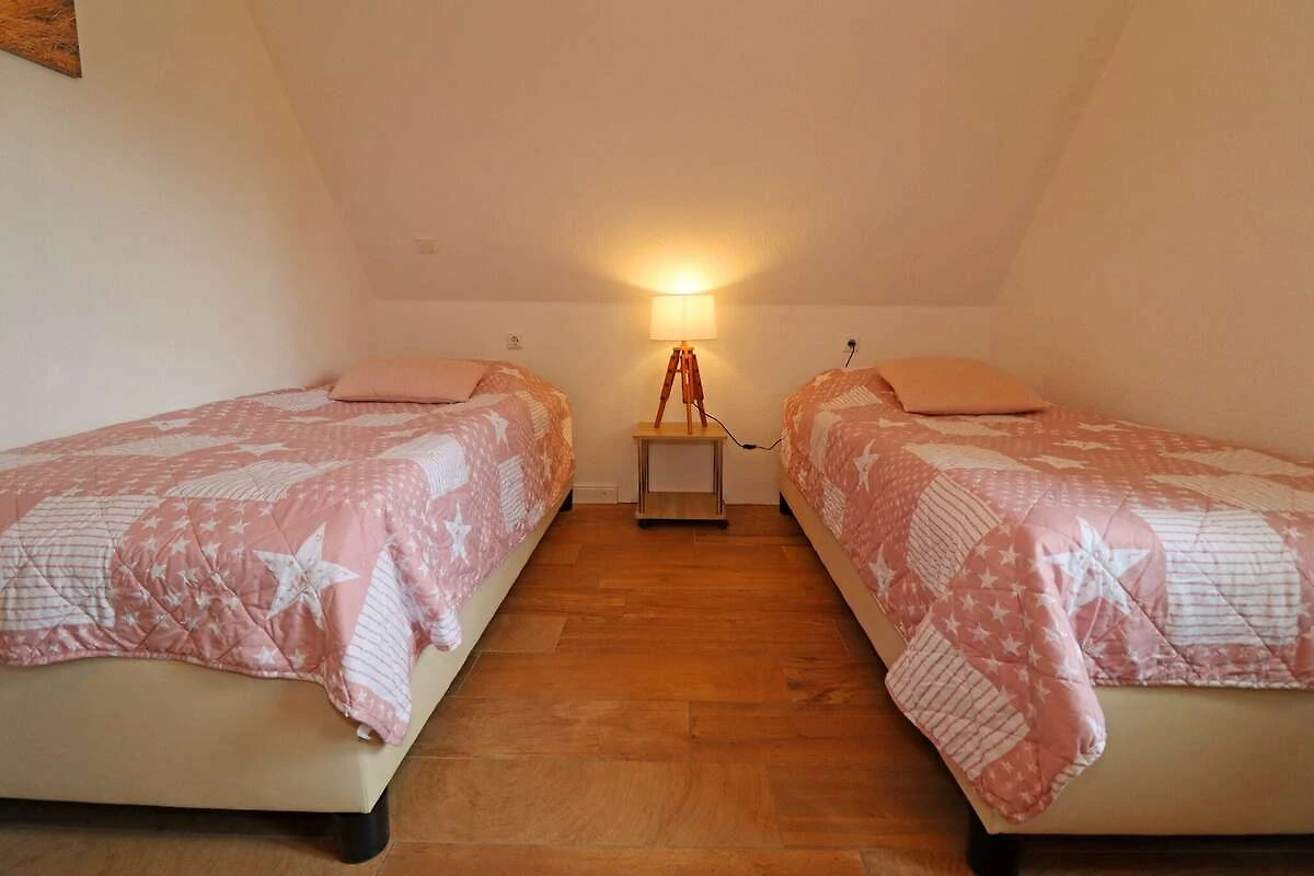 In der 1. Etage: (offene Küche(Esstisch(4 Personen), Wasserkocher, Toaster, Kochherd(2 Kochplatten, Ceranfeld), Dunstabzugshaube, Kaffeemaschine, Mikrowelle, Spülmaschine, Kühlschrank(+ Gefrierfach)), Wohn-/Schlafzimmer(Doppelbett king size(180 x 200 cm), TV(Flatscreen), Sitzecke), Schlafzimmer(2x Einzelbett), Badezimmer(Dusche(ebenerdige Dusche), Waschbecken, Toilette), Balkon oder Terrasse, Heizung(Fußbodenheizung), Dachterasse, Gartenmöbel, Kinderbett, Hochstuhl)