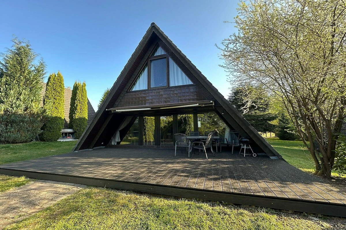 Dieser gemütliche Bungalow ist mit warmen Naturholzmöbeln eingerichtet und schafft eine rustikale und einladende Atmosphäre. Der offene Wohnbereich verfügt über einen Fernseher und eine voll ausgestattete Küche mit Herd, Kaffeemaschine, Toaster und Kühl-Gefrierkombination. Im Obergeschoss befindet sich ein zweites Schlafzimmer mit einem tollen Hochbett, das über eine Leiter erreichbar ist – ideal für Kinder. Draußen erwartet Sie Ihre private Terrasse mit Gartenstühlen, Sonnenschirm und Liegewiese – ideal zum Entspannen oder Genießen der frischen Waldluft.