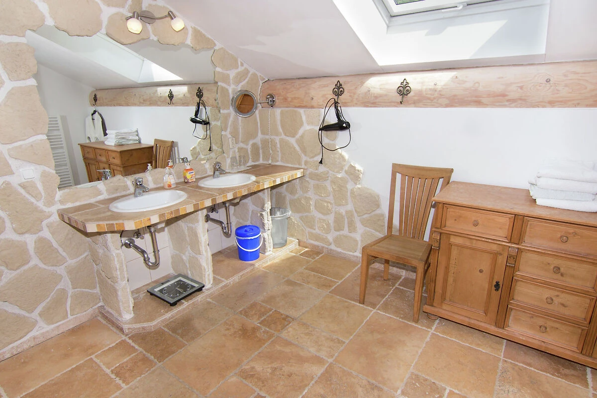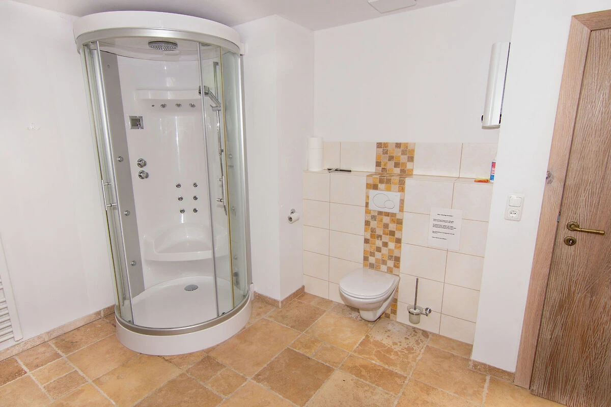 In der 1. Etage: (Schlafzimmer(Doppelbett), Schlafzimmer(Etagenbett), Schlafzimmer(Doppelbett), Schlafzimmer(Doppelbett), Badezimmer(Dusche, 2x Waschbecken, Toilette))