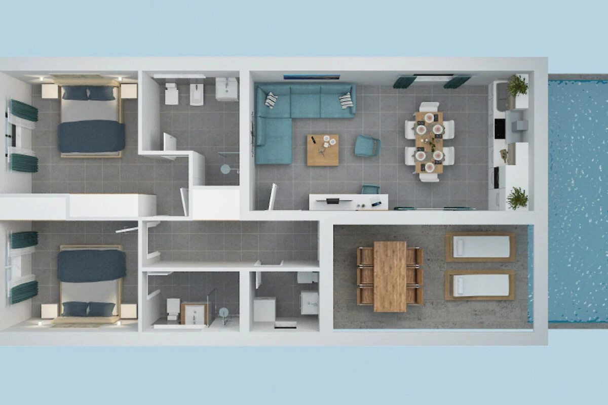 Parterre: (Wohnzimmer(Doppelschlafcouch, TV, Klimaanlage), offene Küche(Esstisch, Wasserkocher, Backofen, Mikrowelle, Spülmaschine, Kühl-/Gefrierkombination, Balkon oder Terrasse), Schlafzimmer mit Badezimmer(Bettnische für 2 Personen, Dusche, Waschbecken, Bidet, Urinal, Klimaanlage, Föhn), Schlafzimmer mit Badezimmer(Bettnische für 2 Personen, Dusche, Waschbecken, Bidet, Urinal, Klimaanlage, Föhn), Badezimmer(Dusche, Waschbecken, Bidet, Urinal, Waschmaschine))