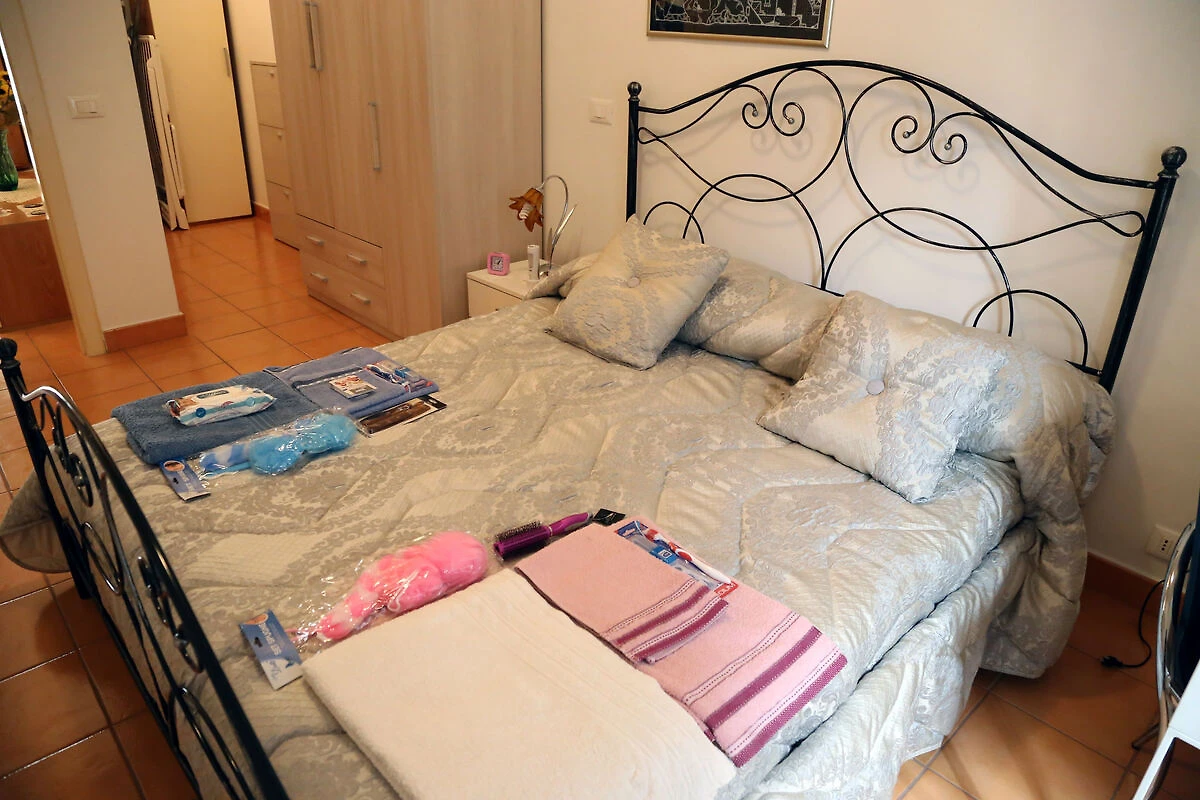 In der 1. Etage: (Wohnzimmer(Schlafcouch 1 Pers., TV), Wohnküche(Kochplatte, Espressomaschine, Backofen, Mikrowelle, Kühl-/Gefrierkombination), Schlafzimmer(Doppelbett), Schlafzimmer(Einzelbett, Einzelbett), Badezimmer(Trockner, Dusche, Waschbecken, Toilette, Bidet, Waschmaschine, Föhn), Balkon, Heizung, Klimaanlage, Kinderbett, Bügelbrett, Bügeleisen)
