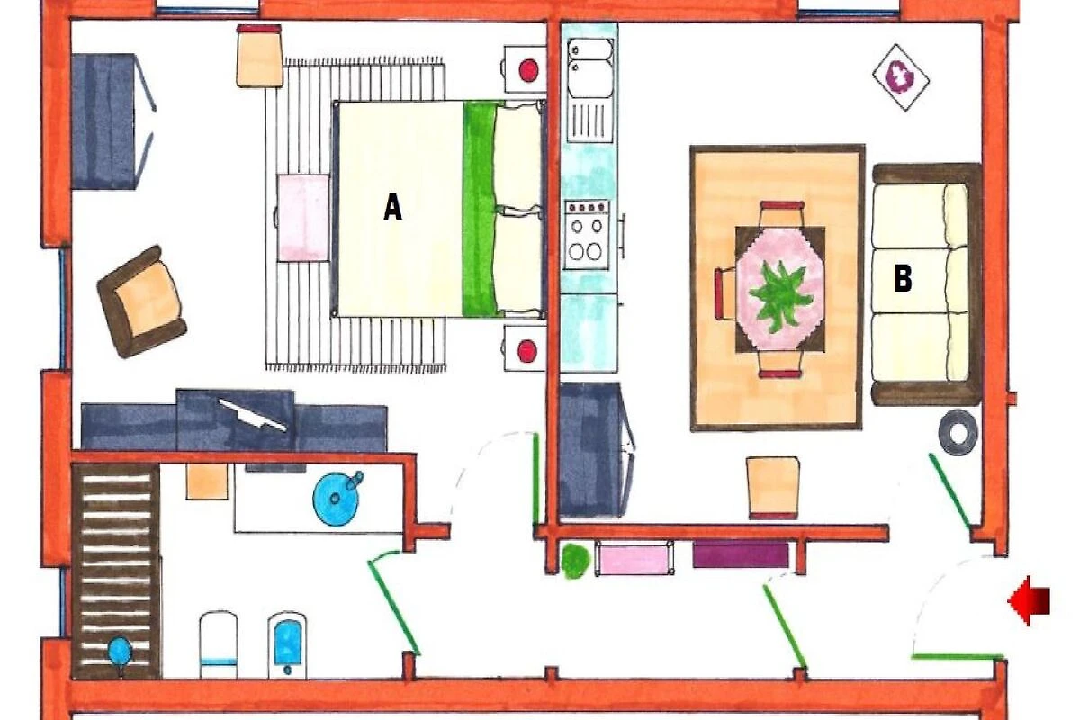 In der 1. Etage: (Diele, Wohnküche(Doppelschlafcouch, Kühl-/Gefrierkombination), Schlafzimmer(Doppelbett, TV), Badezimmer(Dusche, Waschbecken, Toilette, Bidet), Klimaanlage)
