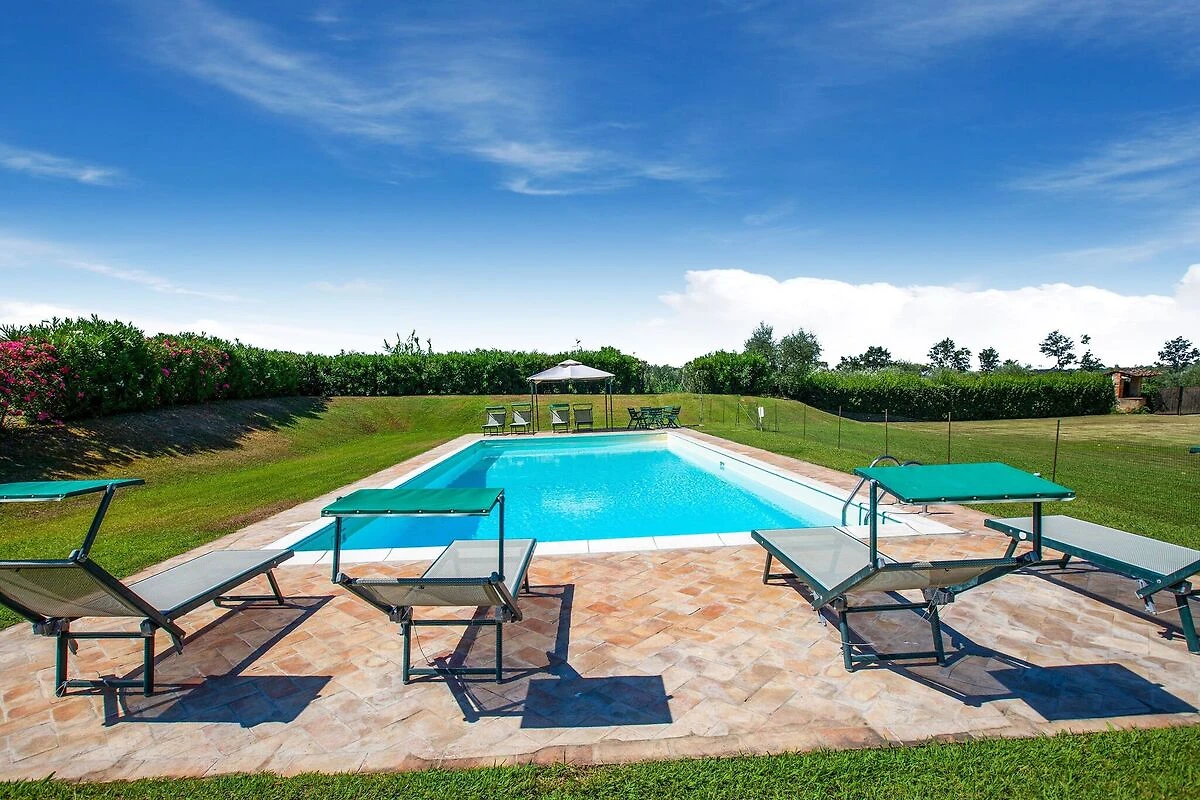 Typisches Bauernhaus, das in ein Ferienhaus umgewandelt wurde und Platz für 8 Personen bietet. Das Bauernhaus verfügt über einen großen, eingezäunten Garten, WLAN-Internetverbindung und einen Swimmingpool zur exklusiven Nutzung. Es ist die ideale Lösung für Gruppen von Freunden oder Familien, die ein einfaches Ferienhaus an einem faszinierenden Ort suchen. Bei der Restaurierung wurde der typisch toskanische Landhausstil respektiert, wobei die Verwendung der ursprünglichen Materialien bevorzugt wurde. Im Außenbereich befindet sich ein schöner, eingezäunter Rasen vor dem Haus, auf dem Sie die Kinder frei laufen lassen können und auf dem sich ein Tisch mit Stühlen befindet für ein Frühstück im Freien. Im Garten befindet sich ein Swimmingpool zur exklusiven Nutzung, der zur Sicherheit der Kinder komplett eingezäunt ist. Auf einer Seite befindet sich der gepflasterte Solariumbereich, in dem sich Sonnenliegen, ein Sonnenschirm und eine Dusche mit kaltem Wasser befinden. Das Haus hat auch eine Loggia in einer alten Scheune für Mahlzeiten im Freien. Parken auf dem Grundstück Der Hof ist ein großes Jagdrevier, daher ist es normal, dass auf den Wiesen in aller Ruhe Rehe, Damwild und andere Tiere weiden.