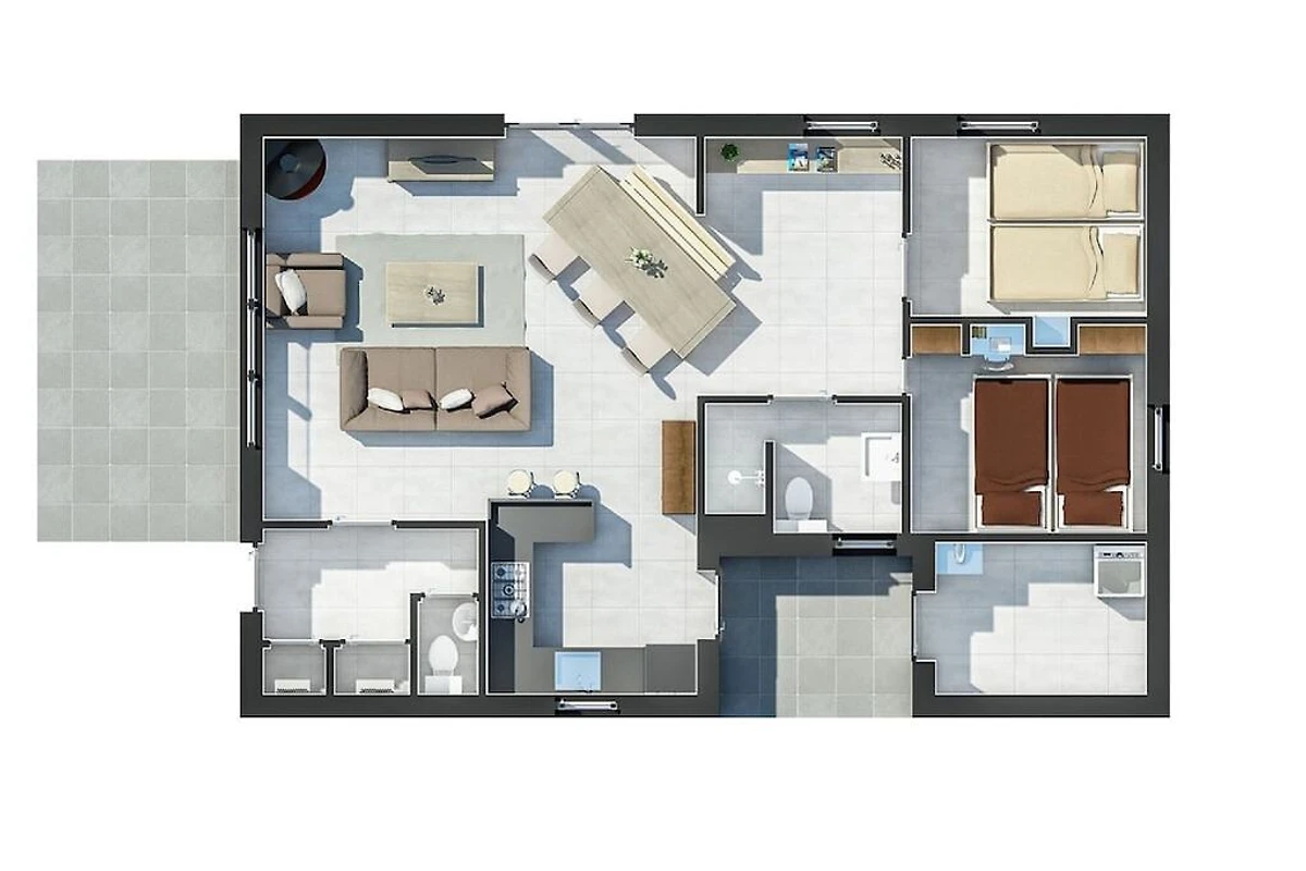 Alle Typen verfügen über mindestens einen Parkplatz und eine herrliche Terrasse mit Gartenmöbeln.