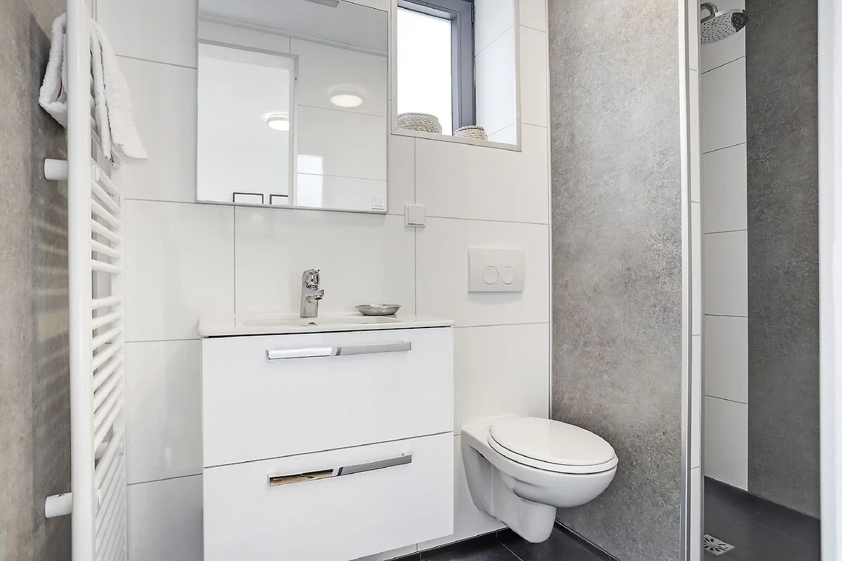 Parterre: (Eingangshalle(Waschbecken, Toilette), Wohnzimmer(TV(Flatscreen), Sitzecke), offene Küche(Wasserkocher, Kochherd(4 Kochplatten, Induktion), Kaffeemaschine(cups), Kombi-Mikrowelle, Spülmaschine, Kühlschrank(+ Gefrierfach)), Schlafzimmer mit Badezimmer(2x Einzelbett, Dusche, Waschbecken), Schlafzimmer mit Badezimmer(2x Einzelbett, Dusche, Waschbecken), Abstellraum(Trockner, Waschmaschine))