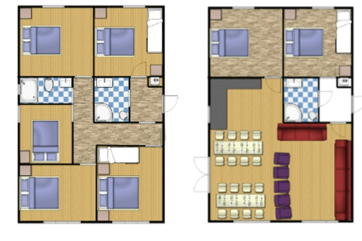 Gästeunterkunft Parterre: (Eingangshalle, Schlafzimmer(Einzelbett, Einzelbett), Schlafzimmer(Einzelbett, Einzelbett), Schlafzimmer(Einzelbett, Einzelbett), Schlafzimmer(Einzelbett, Einzelbett, Etagenbett), Schlafzimmer(Einzelbett, Einzelbett, Etagenbett), Badezimmer(Dusche, Waschbecken, Toilette), Badezimmer(Dusche, Waschbecken, Toilette))