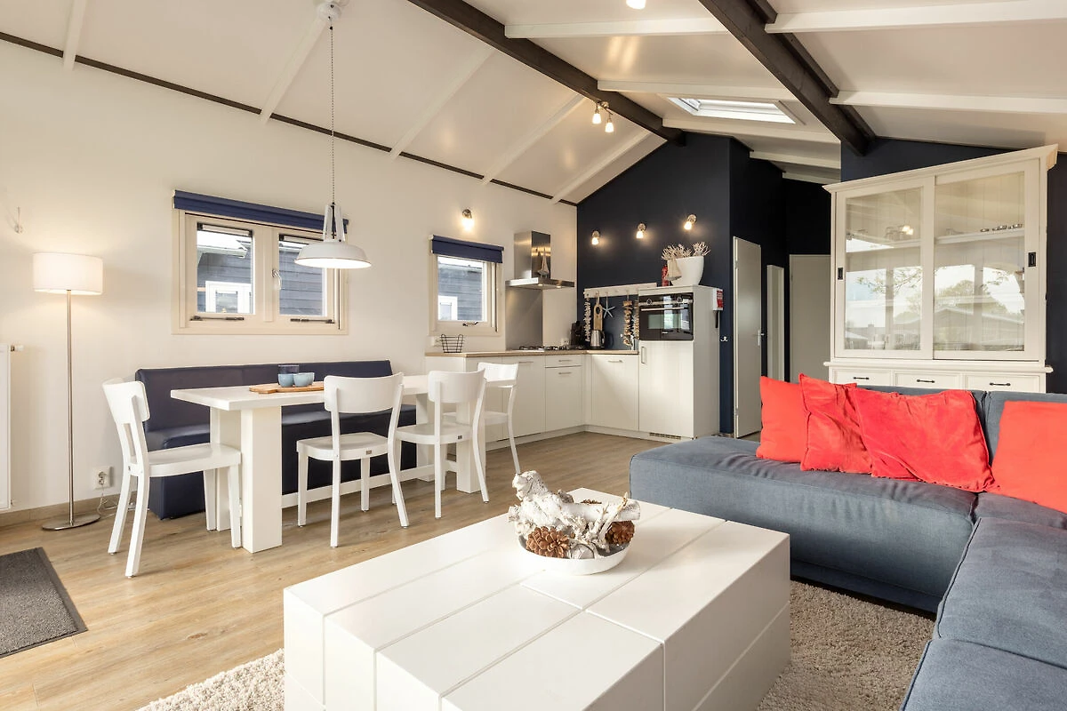 So gibt es das ebenerdige Wassercottage für 4 Personen (NL-8542-03). Sie haben ein Wohnzimmer mit Fernseher und eine offene Küche mit unter anderem Mikrowelle und Geschirrspüler. Sie haben zwei Schlafzimmer, beide mit je zwei Einzelbetten, eventuell zusammengeschoben. Im Badezimmer finden Sie eine Dusche und eine Toilette.