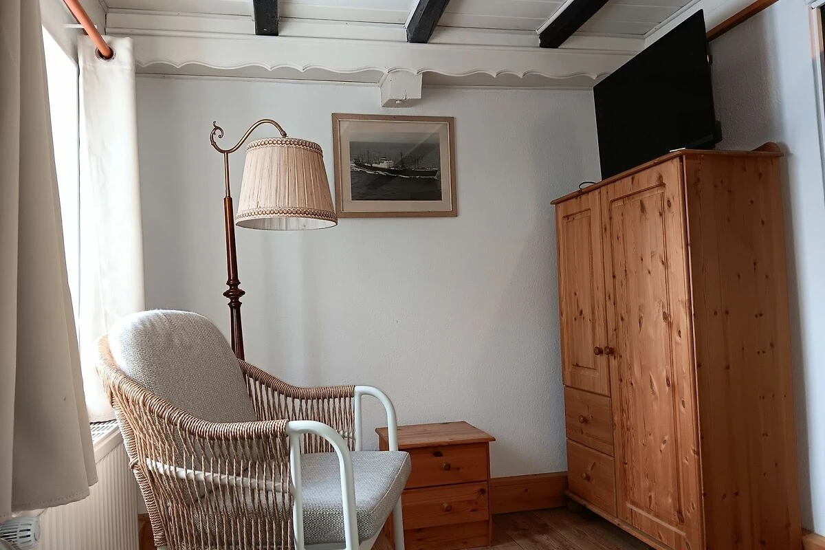 Die Zimmer im Erdgeschoss sind ca. 2 m hoch. Zum Dachgeschoss ( Deckenhöhe 2,30 m) mit dem gemütlichen Wohnzimmer mit Leseecke und einem weiteren Schlafzimmer mit 1 Einzelbett führt eine steile Treppe. . Das Ferienhaus verfügt über einen Fernseher und eine Kompaktanlage mit DVD Spieler. Durch den Kabelanschluss stehen Ihnen über 20 TV Programme zur Auswahl. Im Esszimmer steht ein kleines Radio. Hinter dem Haus befindet sich noch eine kleine windgeschützte Terrasse unter einem grossen Apfelbaum.