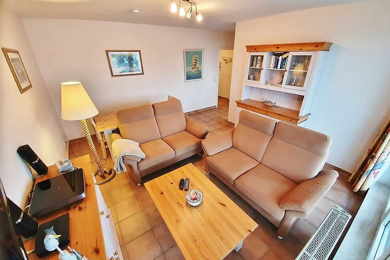 * Wohnbereich mit Couch, Couchtisch,TV sowie eine Home-Cinema-Anlage (CD+DVD)