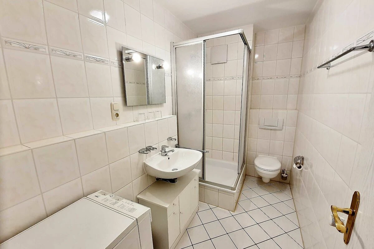* Badezimmer mit Dusche, Waschbecken, WC und Waschmaschine