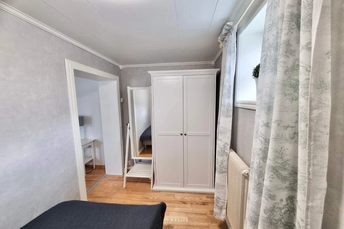 , Aufenthaltsraum(6 m2)(Einzelbett), Vorratsraum(Kochherd(2 Kochplatten), Kaffeemaschine, Mikrowelle, Kühlschrank), Schlafzimmer(15 m2)(Doppelbett, TV(schwedische Fernsehsender)), Badezimmer(Waschbecken, Toilette), Badezimmer(Waschbecken, Dusche, Toilette), Heizung(elektrisch), Innenhof(Gartenmöbel, Grill), Parkplatz