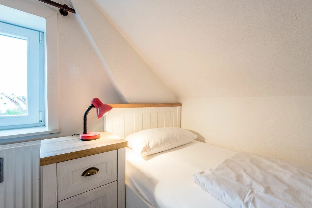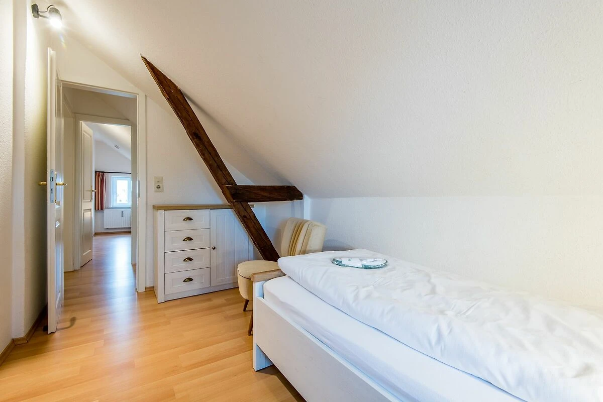 Im Obergeschoss des ruhigen Ferienhauses erwartet Sie eine gemütliche Ferienwohnung mit hellem Laminatboden. Im großen Garten stehen während der Sommerzeit ein Strandkorb und weitere Gartenmöbeln für Sie bereit. Die Kleinen finden dort eine Schaukel und eine Sandkiste zum Spielen.