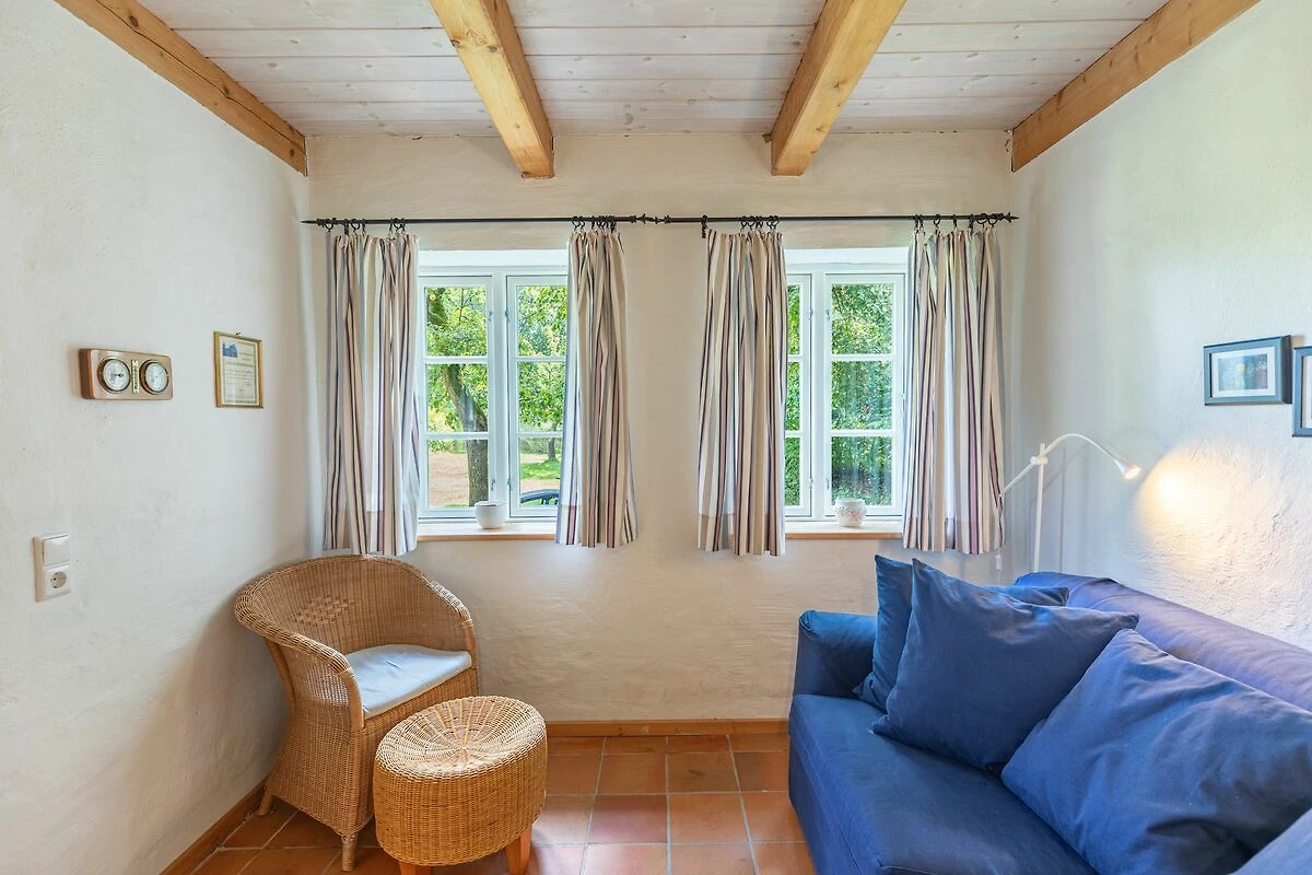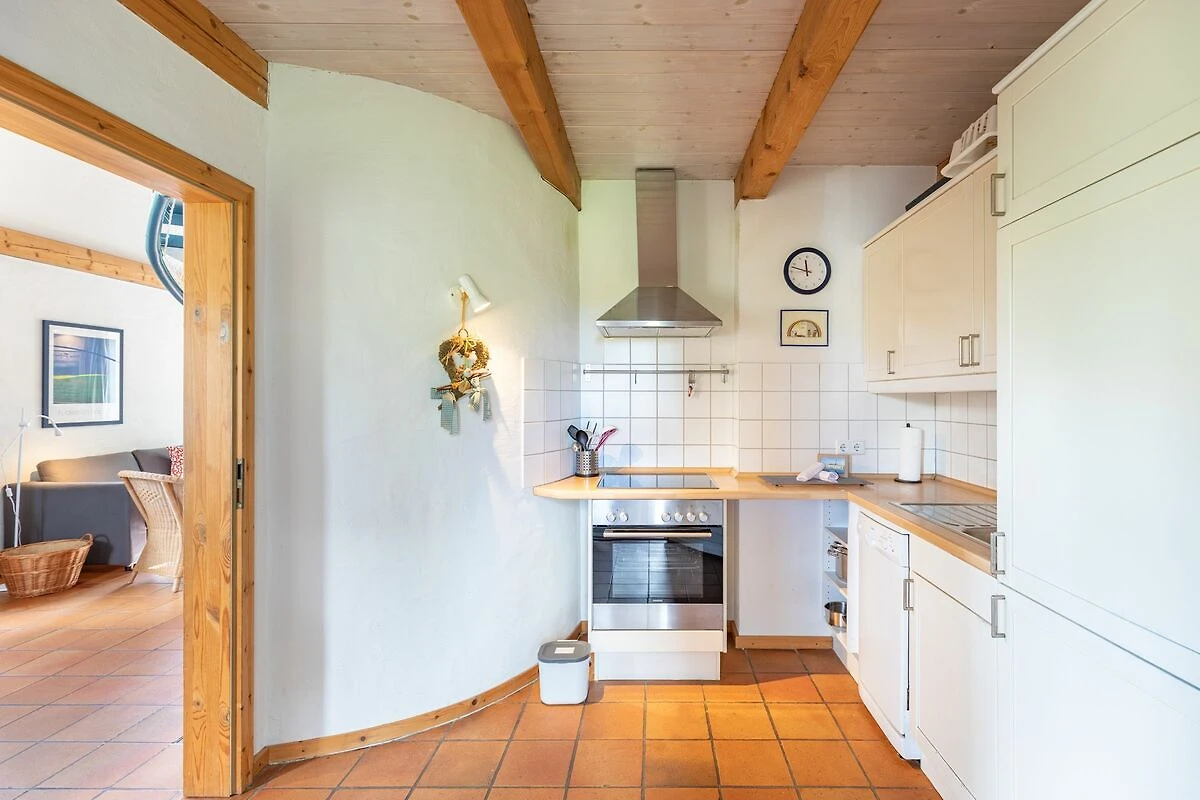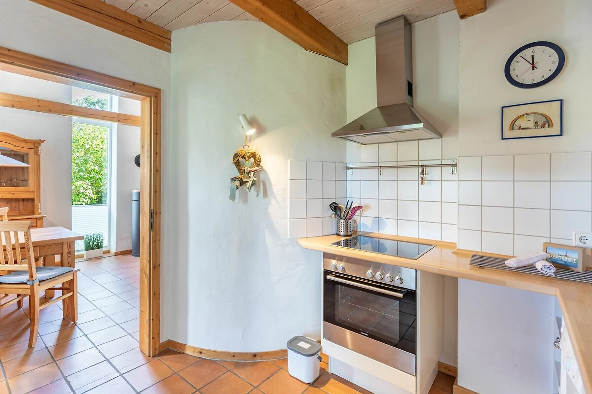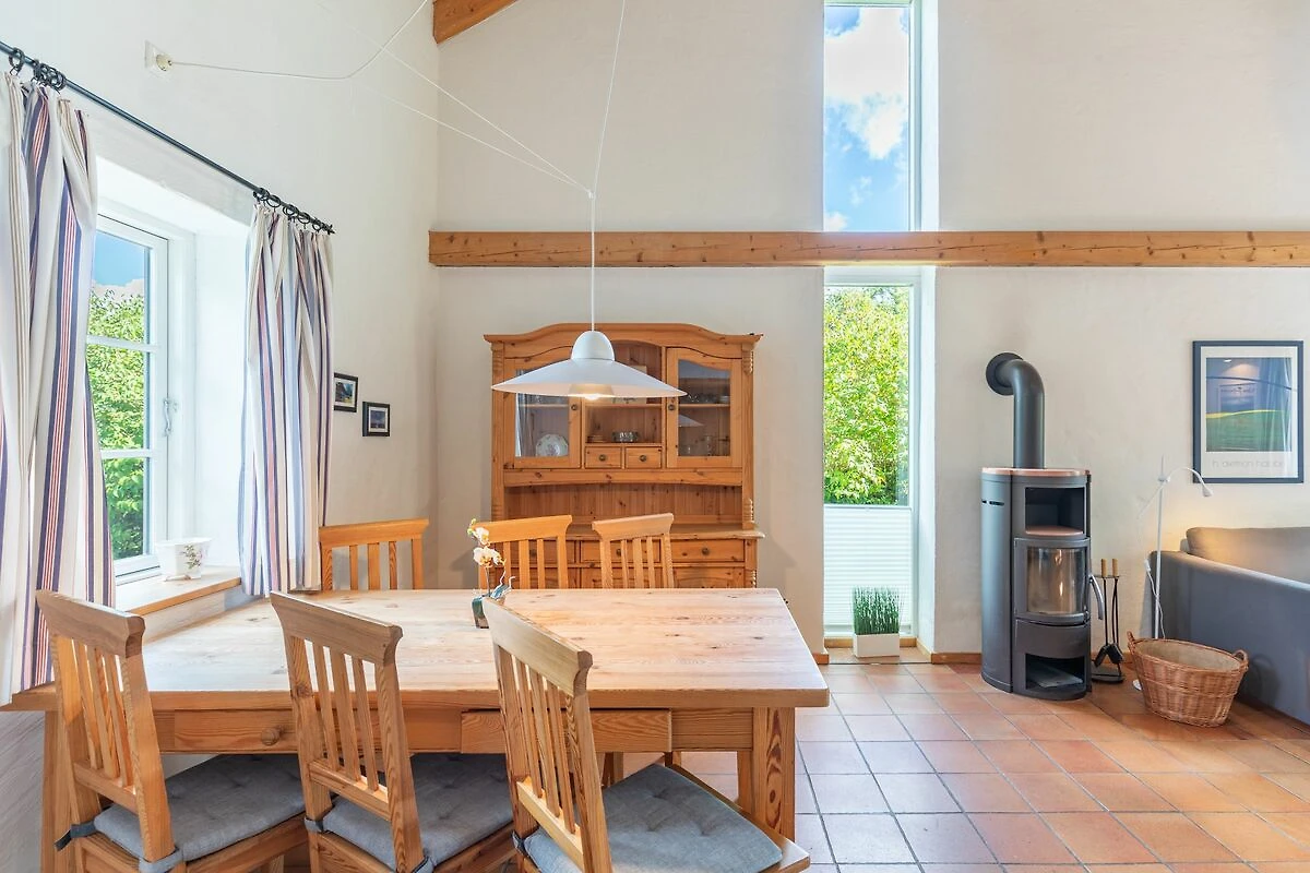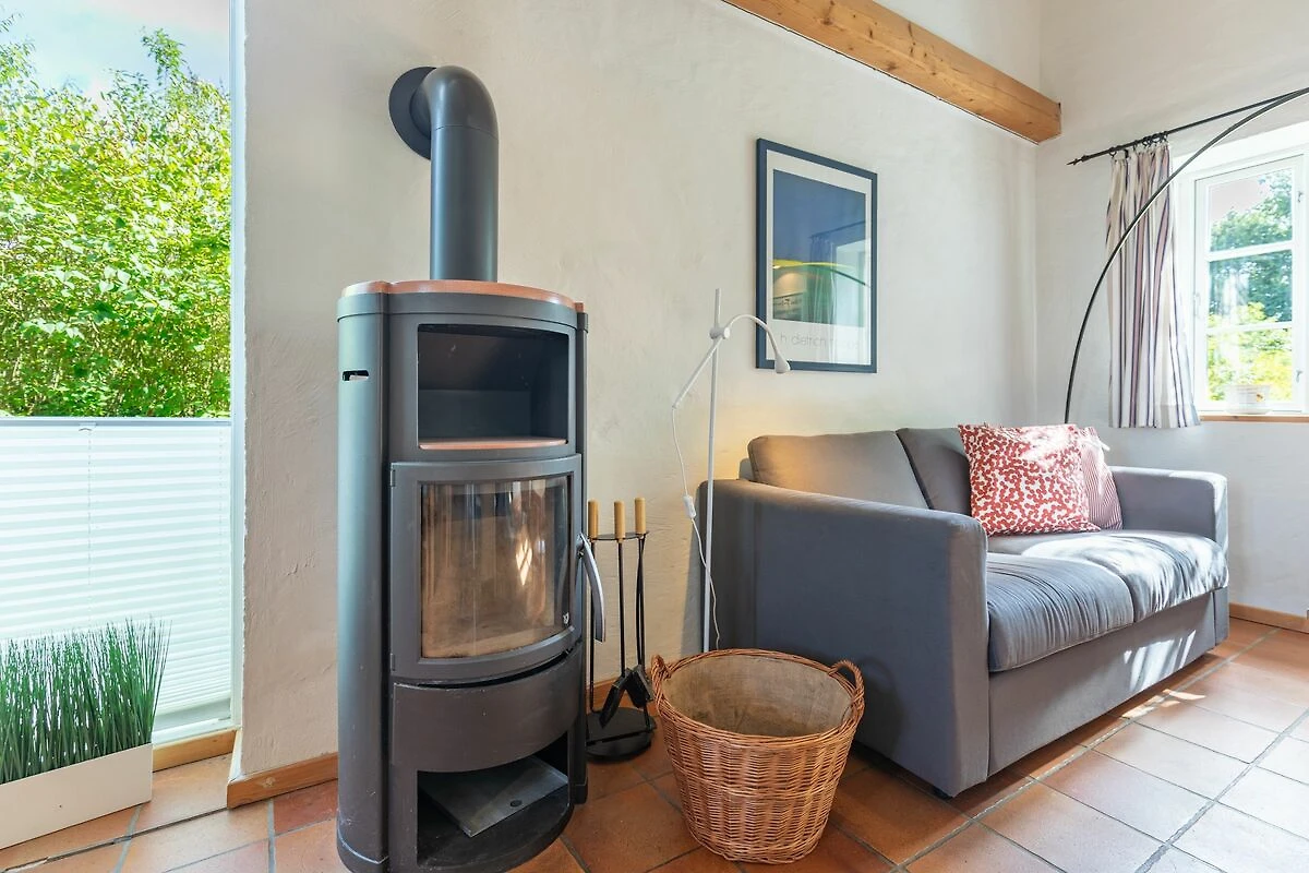 Die Ferienunterkunft empfängt Sie mit einem großzügigen Wohnraum mit hohen Decken. Im Wohnzimmer können Sie es sich auch in der kalten Jahreszeit vor dem prasselndem Feuer im Kaminofen oder dem internetfähigen TV gemütlich machen. Am großen Esstisch finden Sie genügend Platz für Essen und Spiele. Die Küche ist mit allem Notwendigen eingerichtet: Herd mit Ceranfeld, Backofen, Geschirrspülmaschine, Kühlschrank mit Gefrierfach, Toaster, Kaffeemaschine (Filter) und Wasserkocher. In dem Duschbad steht eine Waschmaschine für Sie bereit.
