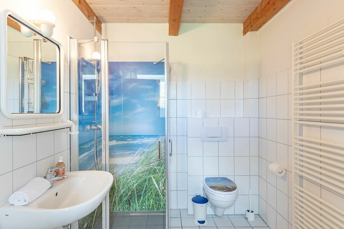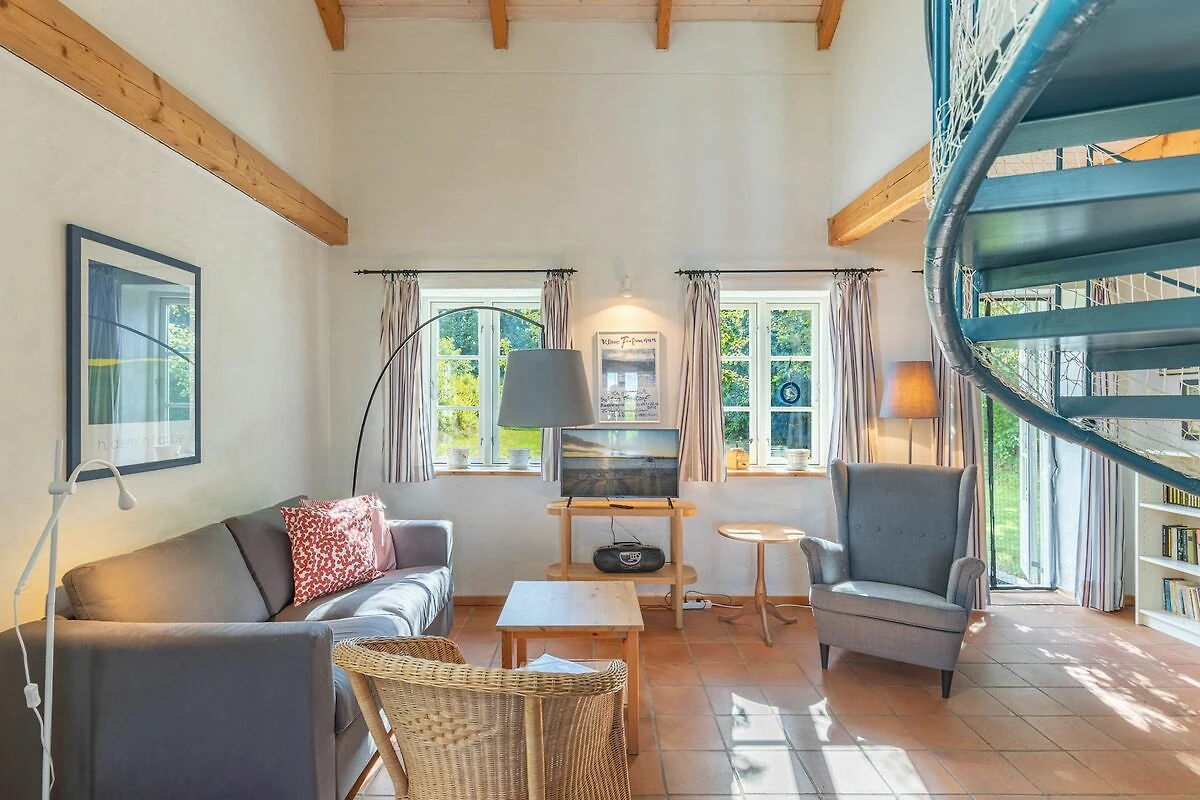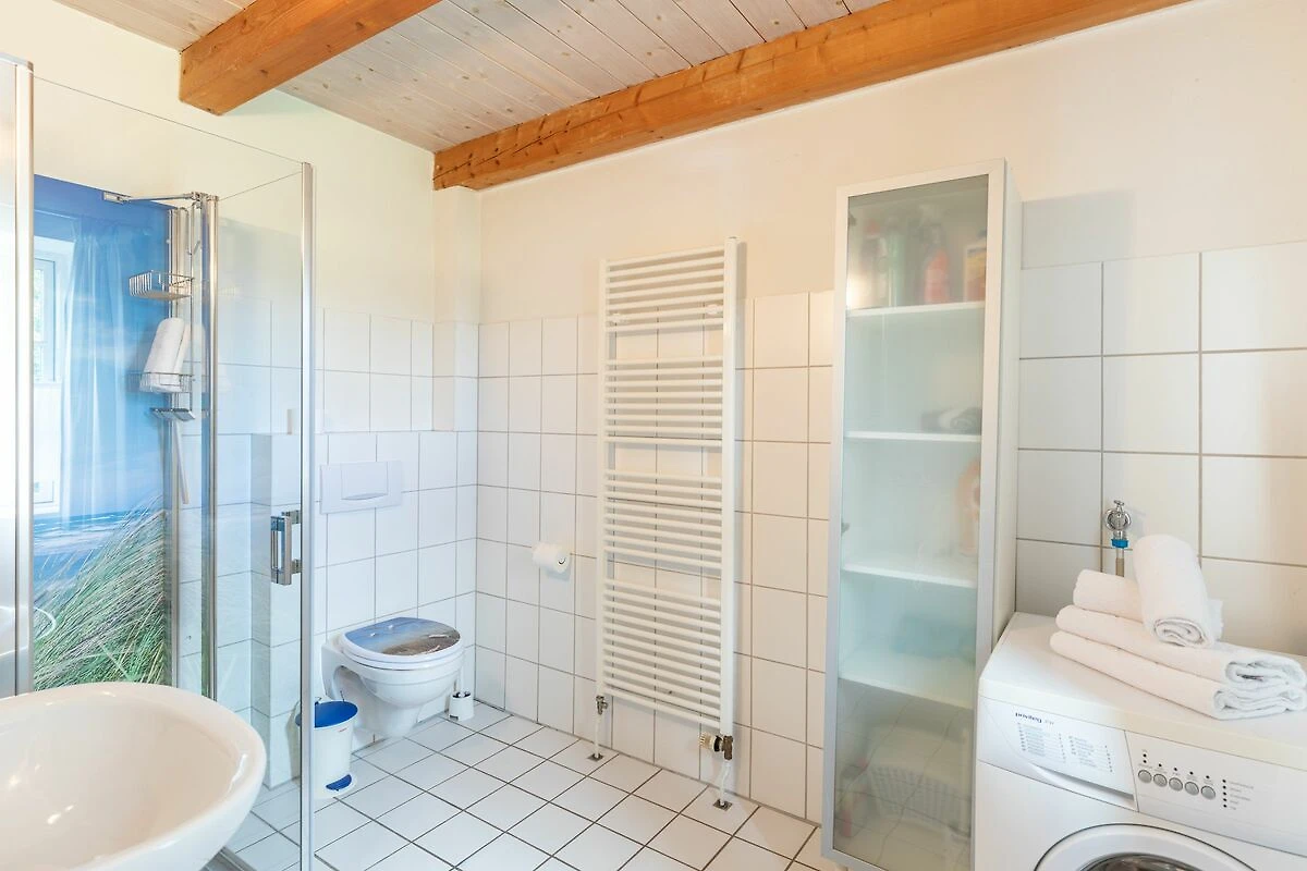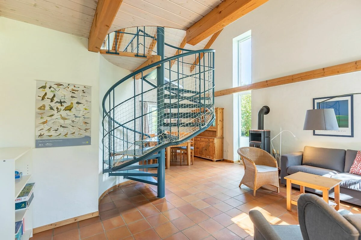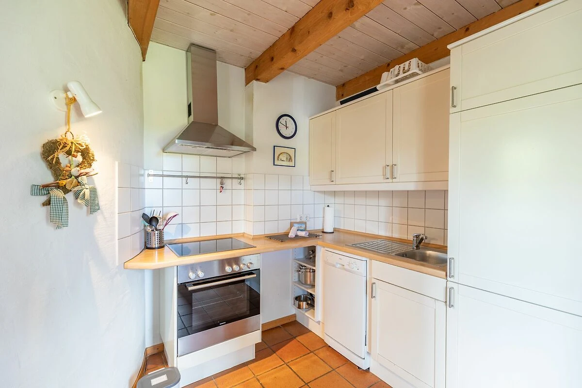 Die Ferienunterkunft empfängt Sie mit einem großzügigen Wohnraum mit hohen Decken. Im Wohnzimmer können Sie es sich auch in der kalten Jahreszeit vor dem prasselndem Feuer im Kaminofen oder dem internetfähigen TV gemütlich machen. Am großen Esstisch finden Sie genügend Platz für Essen und Spiele. Die Küche ist mit allem Notwendigen eingerichtet: Herd mit Ceranfeld, Backofen, Geschirrspülmaschine, Kühlschrank mit Gefrierfach, Toaster, Kaffeemaschine (Filter) und Wasserkocher. In dem Duschbad steht eine Waschmaschine für Sie bereit.