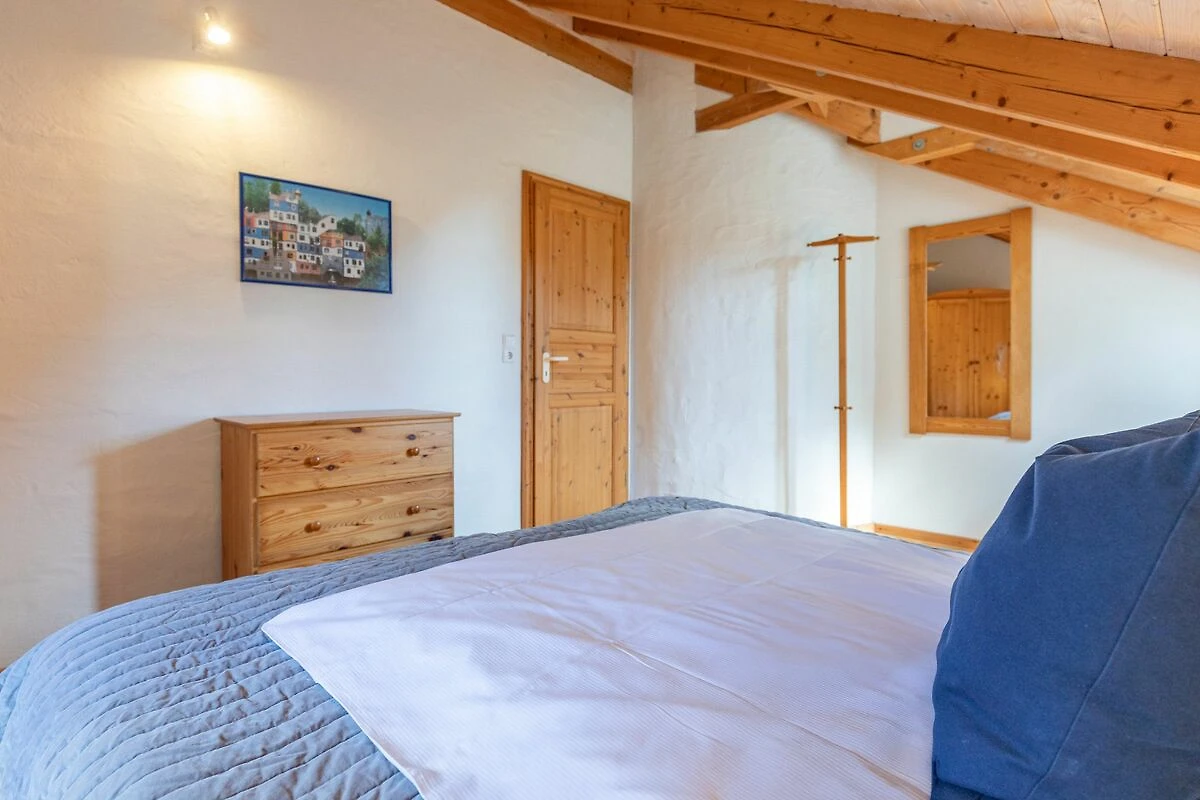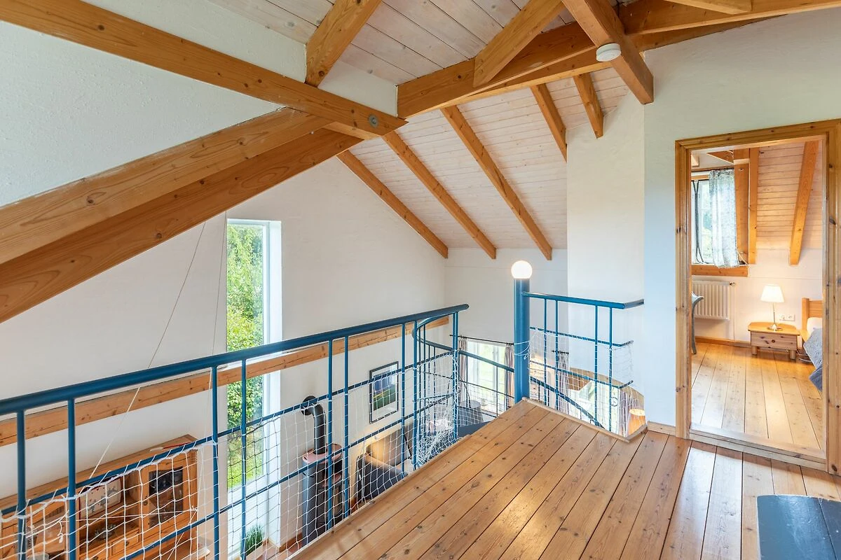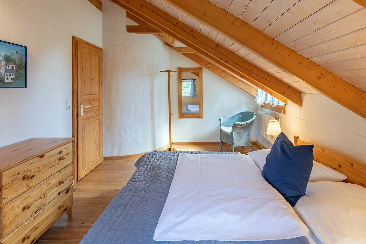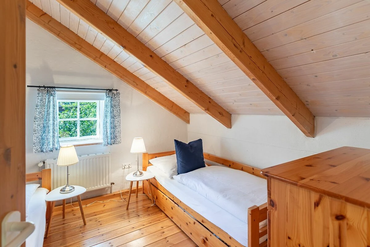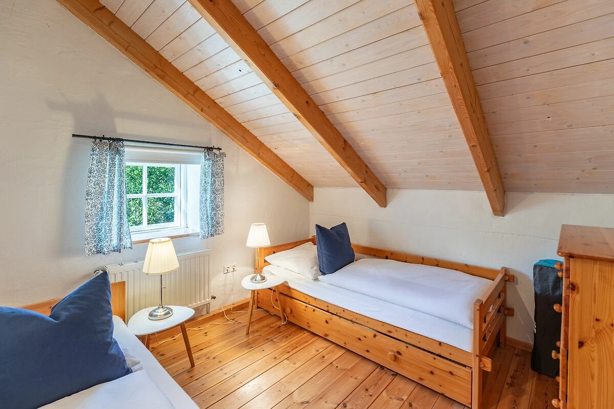 Über eine Wendeltreppe (Treppensicherung vorhanden) gelangen Sie in die beiden Schlafräume mit einem Doppelbett (180 x 200) und zwei Einzelbetten.