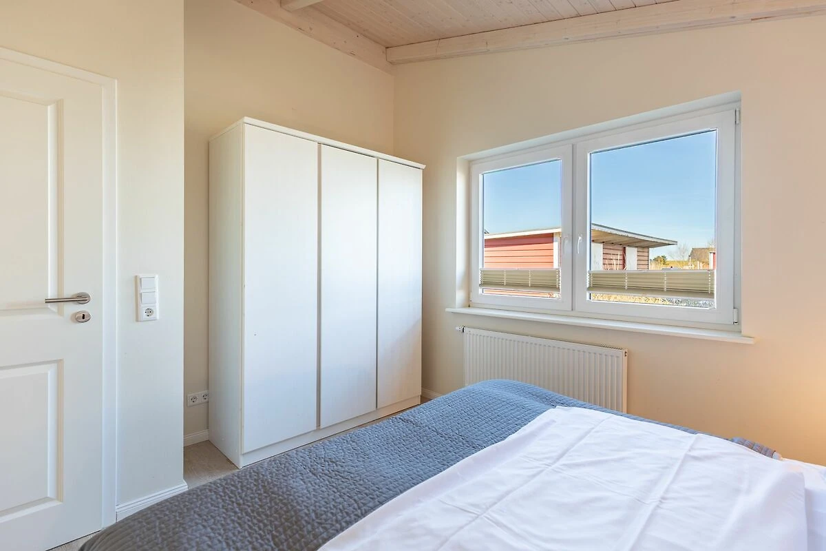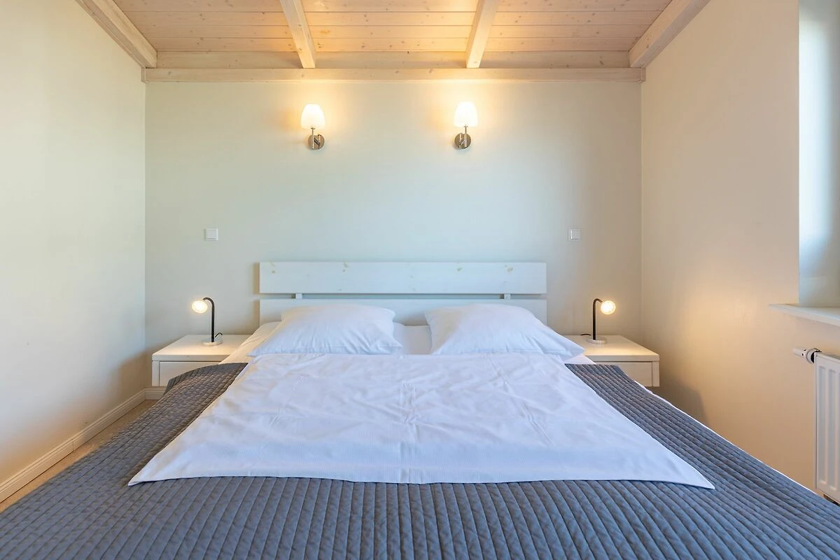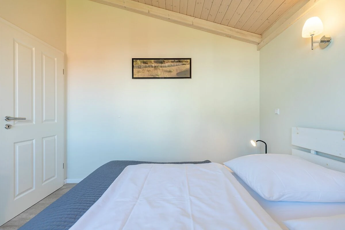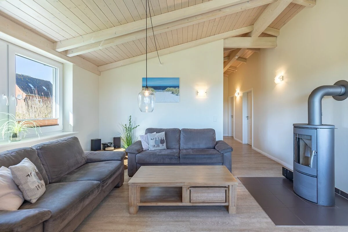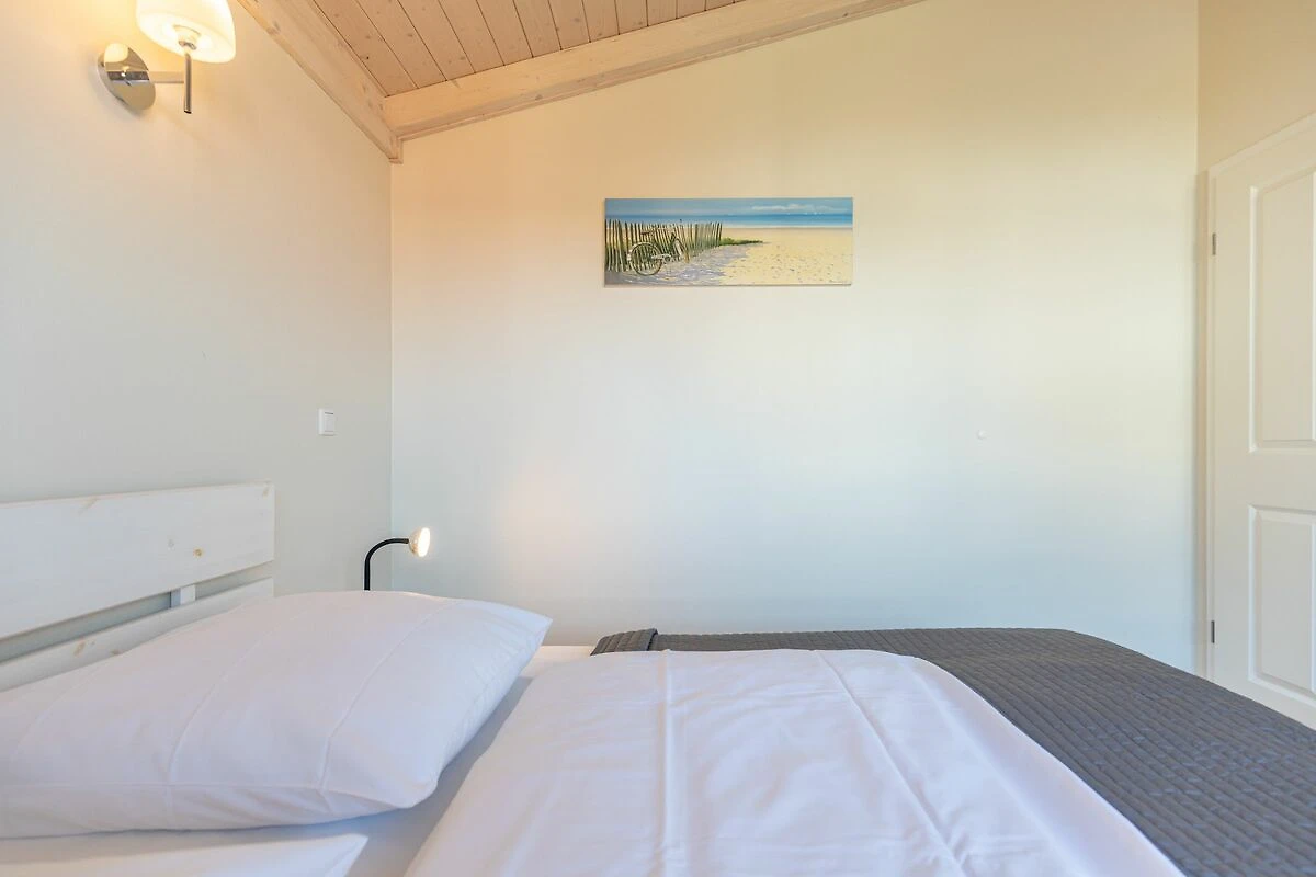 Das 85 qm große Ferienhaus ist modern und exklusiv im skandinavischen Charme eingerichtet. Die zwei Schlafzimmer mit jeweils einen Komfort-Doppelbett (180 x 200 cm) bieten Platz für bis zu vier Personen. Das gemütliche Wohnzimmer ist mit SAT-TV und einem Blu-Ray-DVD-Player ausgestattet. Der Kaminofen sorgt auch in der kälteren Jahreszeit für behagliche Stunden. Die offene Küche bietet Ihnen eine exklusive und umfangreiche Ausstattung, die das Herz eines jeden Hobbykochs höher schlagen lässt: Ceranfeld mit 4 Kochplatten, Backofen, Kühlschrank mit ***Gefrierfach, Mikrowelle, Geschirrspüler, Filterkaffeemaschine uvm. Das Badezimmer lässt keine Wünsche offen: zwei Waschbecken, eine große Badewanne, eine ebenerdige Dusche und eine schöne Sauna geben Ihrem Urlaub den richtigen Rahmen. Das Ferienhaus verfügt über ein zusätzliches WC. Auf der überdachten, windgeschützten Terrasse können Sie auf bequemen Gartenstühlen, den Sonnenliegen oder im Strandkorb die Sonne genießen.