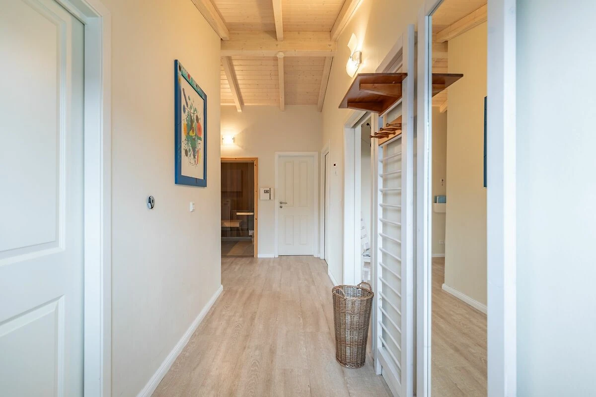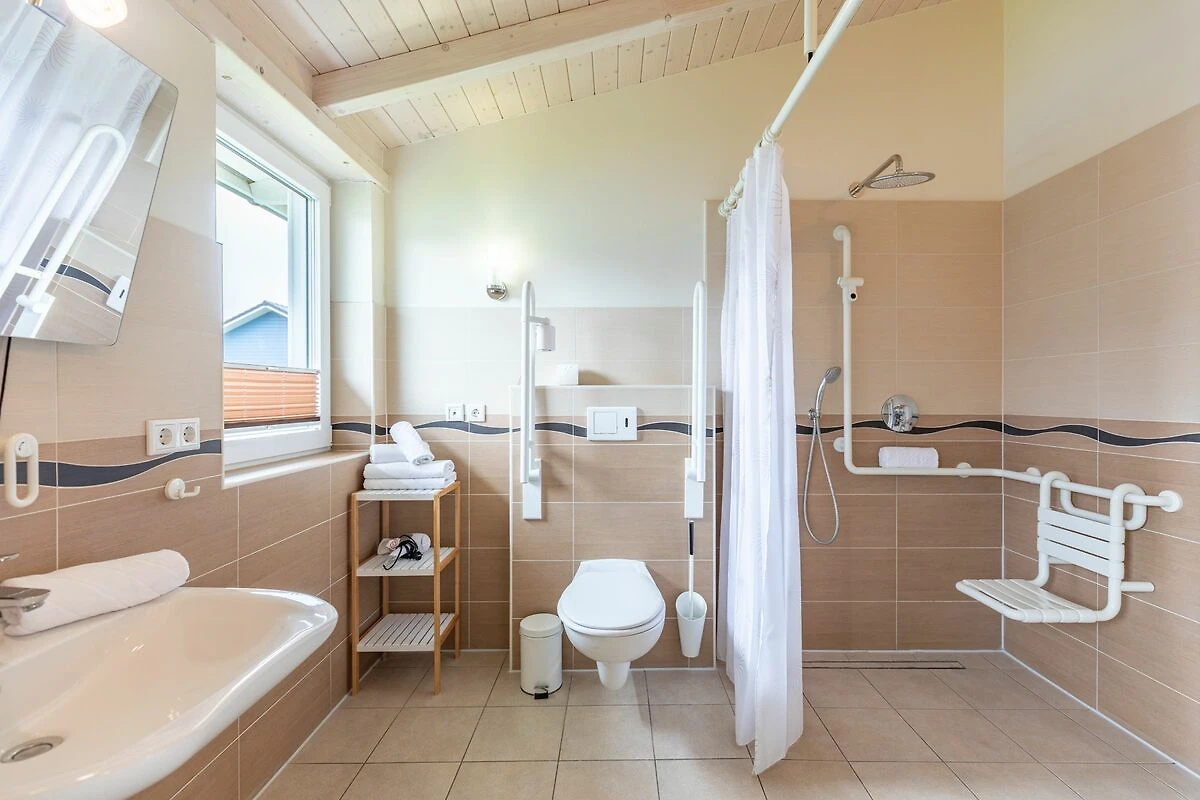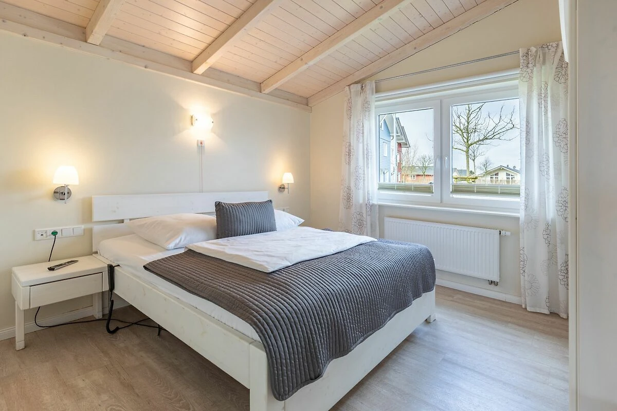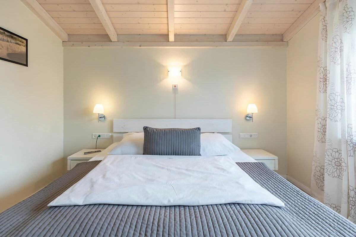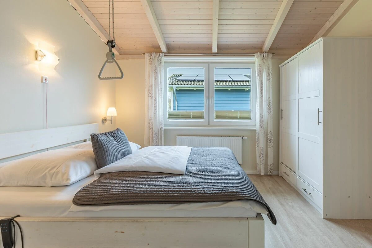 Das 90 qm große Ferienhaus ist modern und exklusiv im skandinavischen Charme eingerichtet. Die zwei Schlafzimmer mit jeweils einem Komfort-Doppelbett (180 x 200 cm) bieten Platz für bis zu 4 Personen. In dem einen Schlafzimmer ist der Lattenrost elektrisch verstellbar und mit einem Lifter unterfahrbar. In den Schlafräumen, der Sauna und im Badezimmer befindet sich ein Notrufsystem. Beide Schlafzimmer sind mit einem Fernseher ausgestattet.