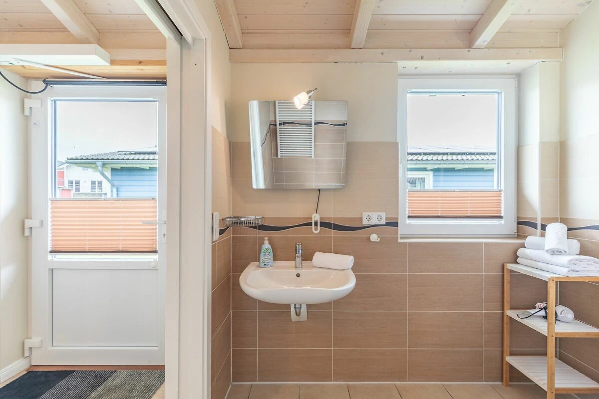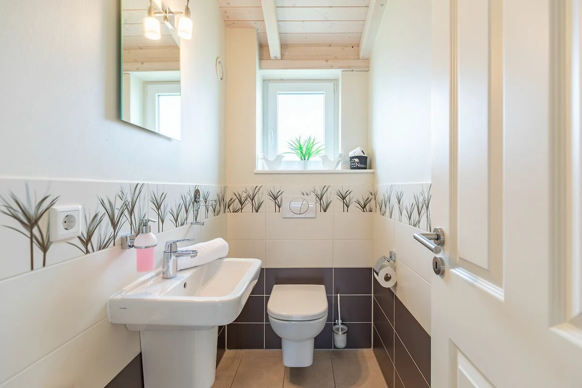 Das Badezimmer lässt keine Wünsche offen: zwei Waschbecken und eine ebenerdige Dusche geben Ihrem Urlaub den richtigen Rahmen. Das Ferienhaus verfügt über ein zusätzliches WC. Auf der überdachten, windgeschützten Terrasse können Sie auf bequemen Gartenstühlen, den Sonnenliegen oder im Strandkorb die Sonne genießen.