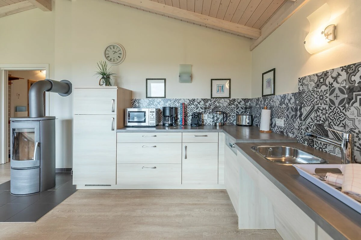 Dieses Ferienhaus eignet sich auch besonders für gehbeeinträchtigte Gäste und/oder Rollstuhlfahrer. Alle Türen sind Schiebetüren oder auch elektrisch zu bedienen. Die offene Küche bietet Ihnen eine exklusive und umfangreiche Ausstattung, die das Herz eines jeden Hobbykochs höher schlagen lässt: Ceranfeld mit 4 Kochplatten, Backofen, Kühlschrank mit ***Gefrierfach, Mikrowelle, Geschirrspüler, Filterkaffeemaschine, Nespresso Kapselmaschine uvm. Die Küche ist unterfahrbar, höhenverstellbar und komplett auf Rollstuhlfahrer ausgelegt. Sie verfügt u. a. über eine Dunstabzugshaube mit Fernbedienung und einen Backofen mit versenkbarer Tür.