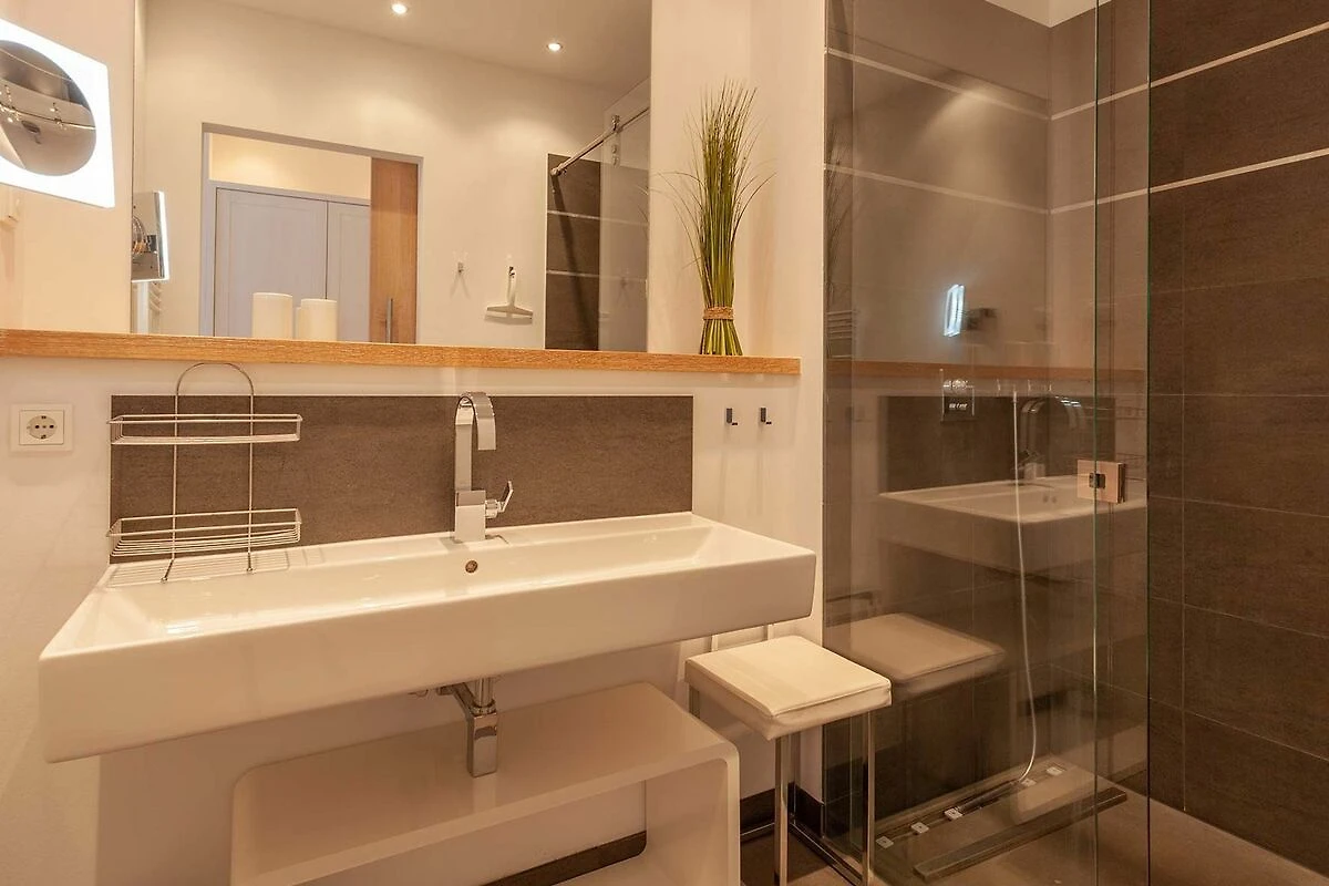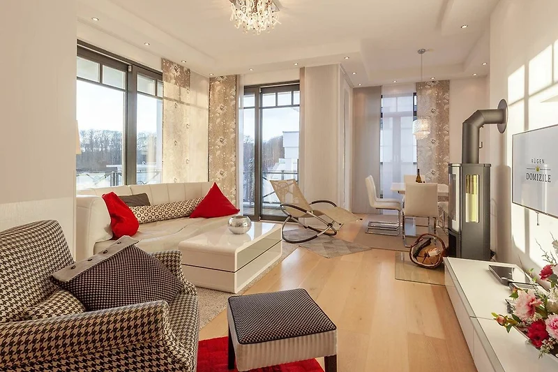 Dank der vielen bodentiefen Fenster, erwartet Sie eine rundum lichtdurchflutete Unterkunft, welche hohen Ansprüchen genügt. Die Wohnung selbst verfügt über einen hochwertigen Wohnbereich mit Fussbodenheizung und Kaminofen, gemütlichen Sofa, Essbereich und offener Küche. Die beiden Schlafzimmer verfügen jeweils über ein eigenes Ensuite-Bad. Zusätzlich dazu, gibt es noch ein weiteres Gäste-WC.