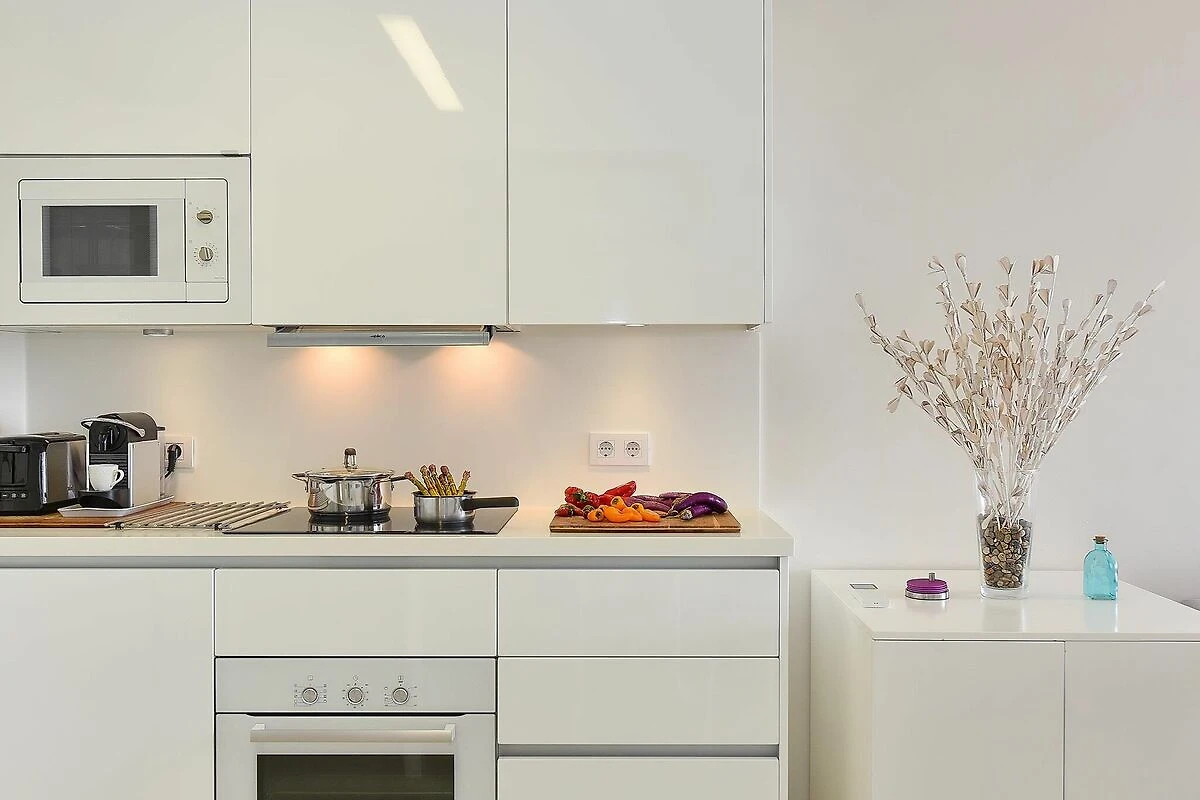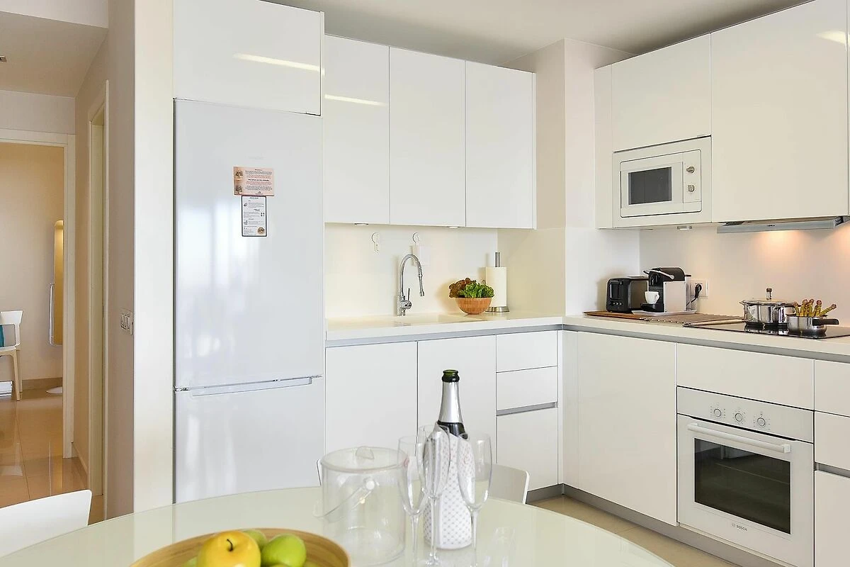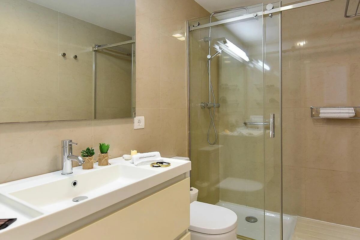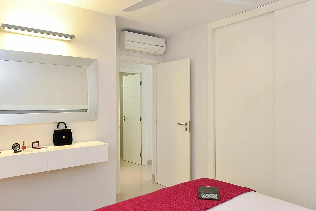 In der 1. Etage: (offene Küche(Wasserkocher, Toaster, Kochherd(4 Kochplatten, Ceranfeld), Kaffeemaschine, Backofen, Mikrowelle, Spülmaschine, Kühl-/Gefrierkombination), Wohn/Esszimmer(TV(Satellit, Deutsch Fernsehsender), DVD-Spieler), Schlafzimmer(Doppelbett), Schlafzimmer(2x Einzelbett), Badezimmer(Dusche, Toilette, Föhn), Trockner, Waschmaschine, Balkon, Klimaanlage, Gartenmöbel, Hochstuhl, Babybett (kostenlos))