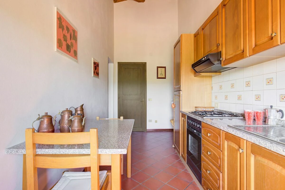 Eingebettet in die sanften Hügel der Toskana bietet dieses charmante Apartment einen ruhigen Rückzugsort auf dem Land im Herzen von Peccioli. Das Haus liegt auf einem historischen Anwesen mit herrlicher Aussicht und verbindet rustikalen Stil mit praktischem Komfort. Gäste können den Gemeinschaftspool, den üppigen privaten Garten zum Sonnenbaden oder gemütlichen Brunch sowie die Außenbereiche zum Entspannen genießen. Vom Grillabend bis zum Entspannen unter einem Sonnenschirm mit regionalem Wein – hier erleben Sie authentische italienische Momente. Kinder werden die Spielgeräte und den Fußballplatz lieben, während Erwachsene vor Ort Weine verkosten oder die wöchentlichen toskanischen Abendessen und Pizza genießen können.