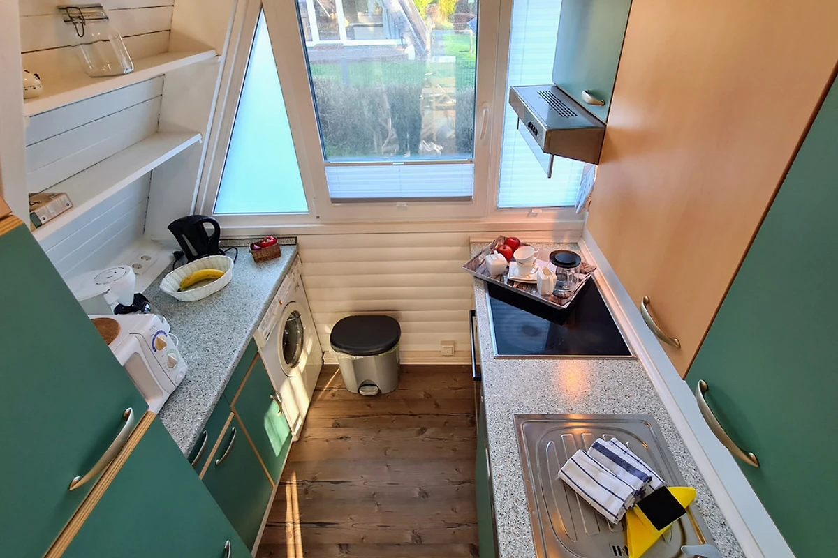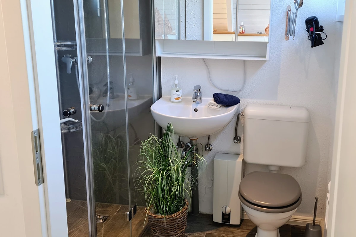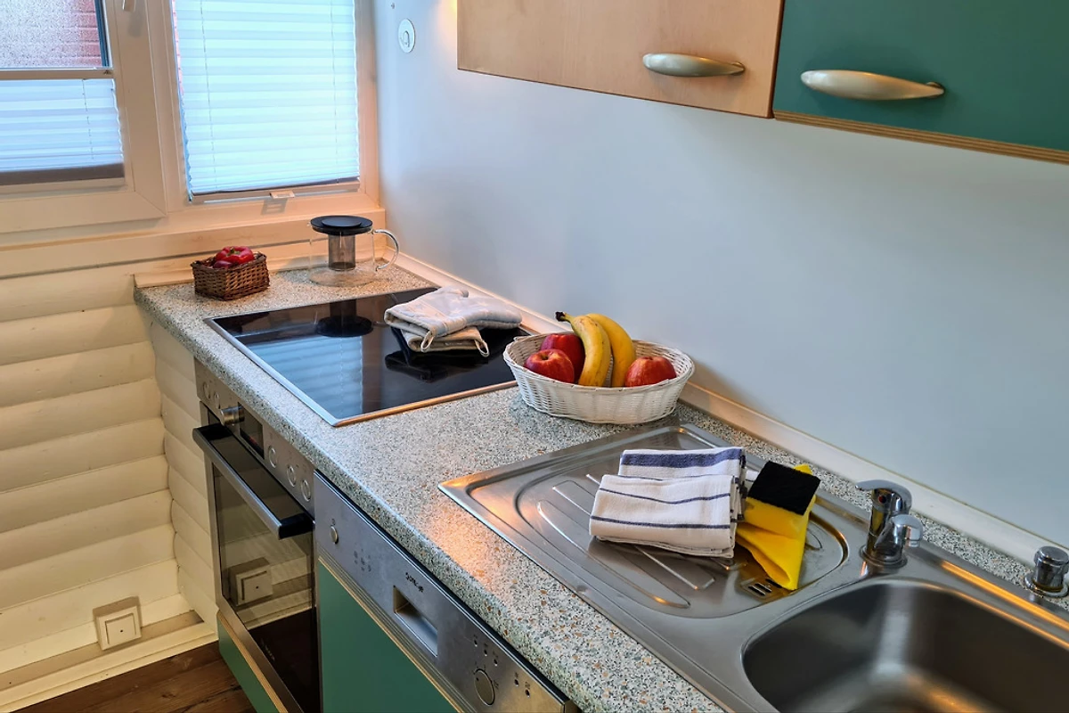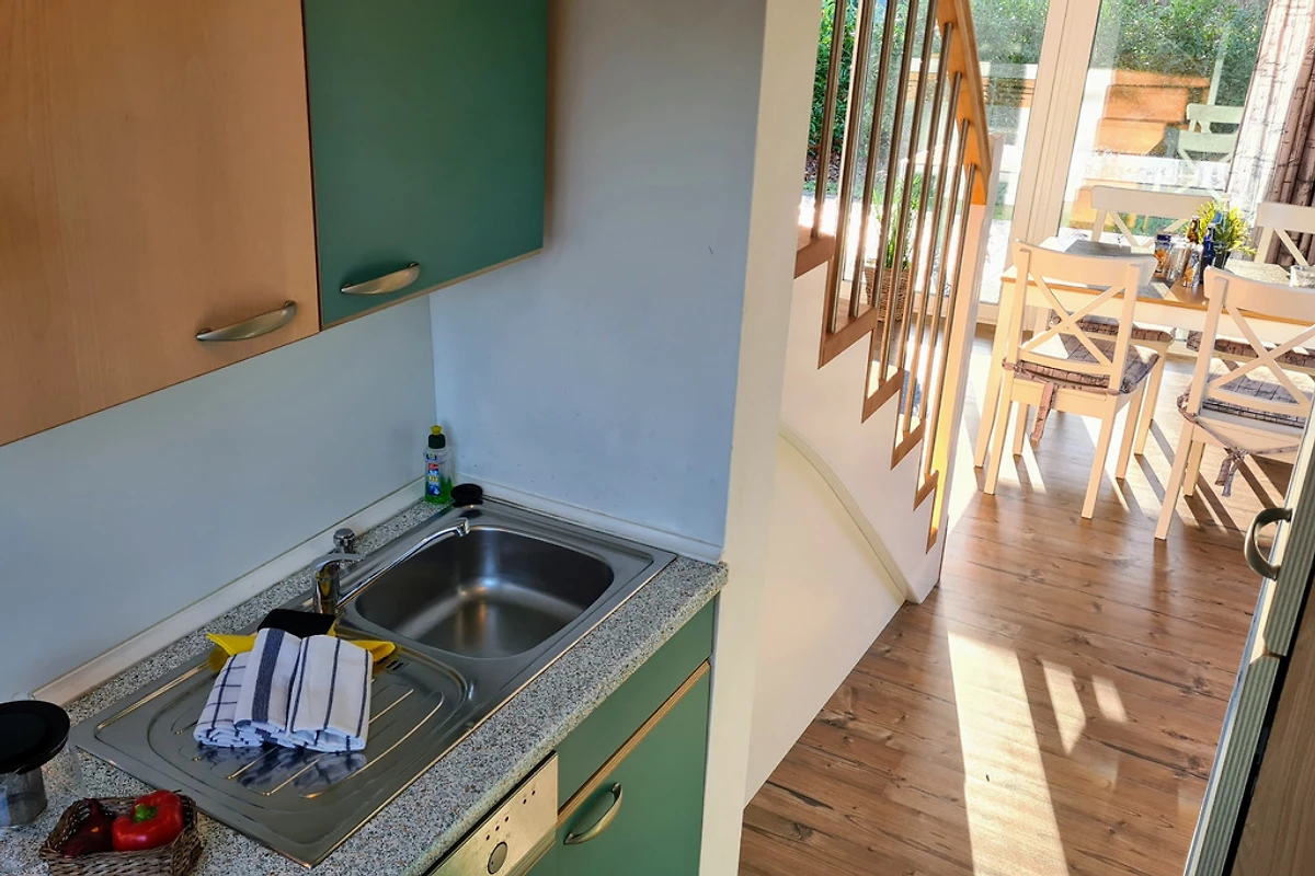 Im Erdgeschoss des Hauses finden Sie einen geräumigen Wohn-und Essbereich für gemütliches Beisammensein, die voll ausgestattete Küche und ein modernes Duschbad.