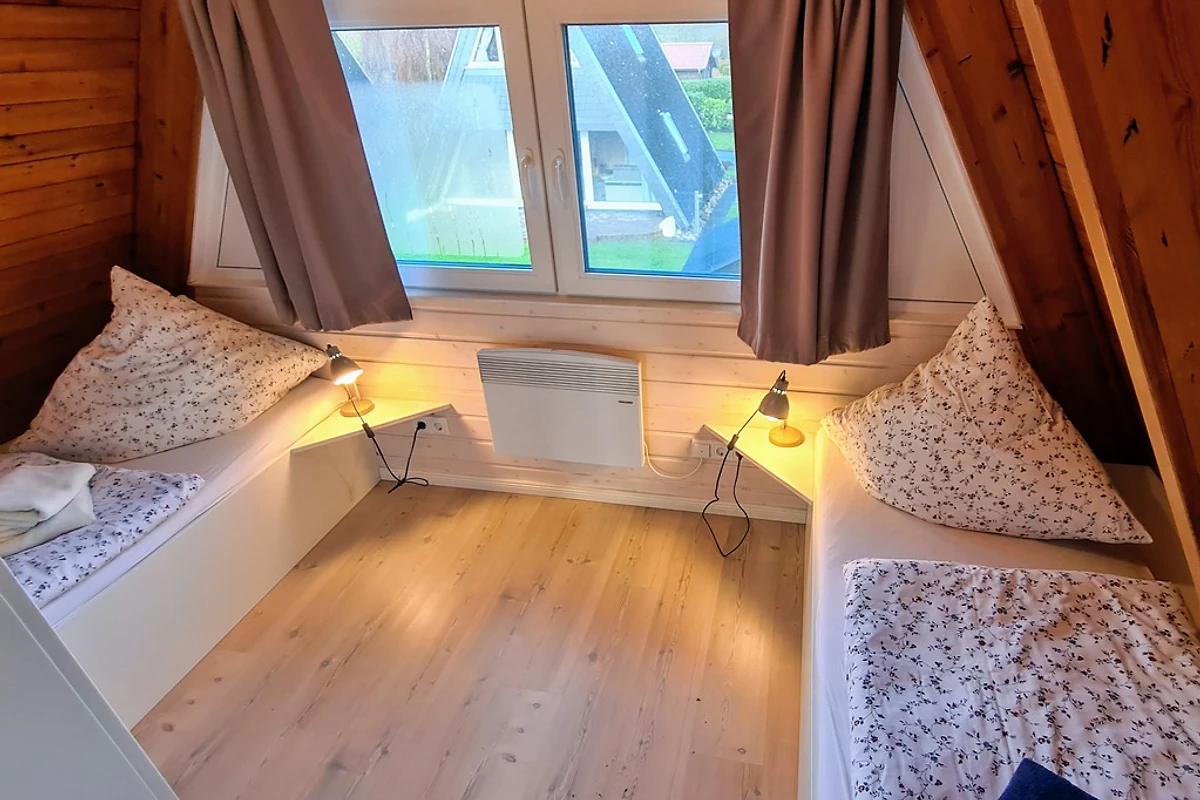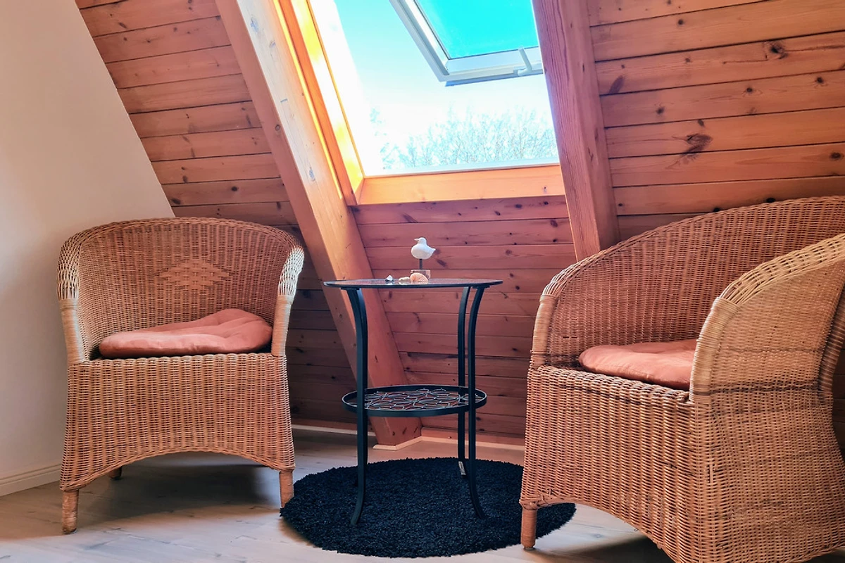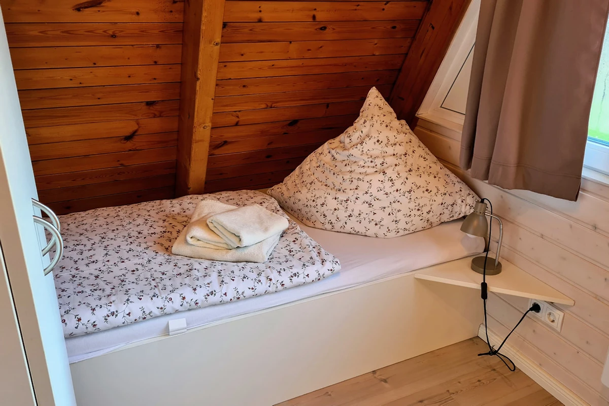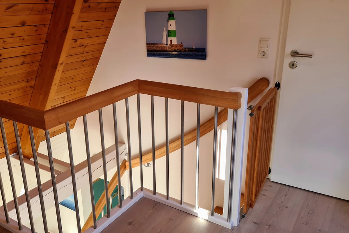 Vom Wohnbereich aus führt eine Treppe in die obere Etage. Hier erwartet Sie ein kleiner Bereich, um sich mit einem guten Buch zurückzuziehen und die beiden Schlafzimmer, eines mit Doppelbett und eines mit zwei Einzelbetten. Ein Bettchen für unsere kleinen Gäste bis 2,5 Jahre kann bei Bedarf aufgestellt werden.