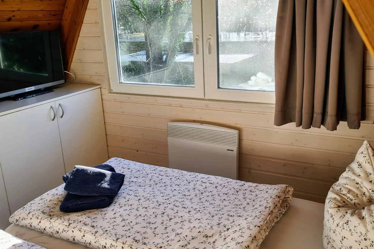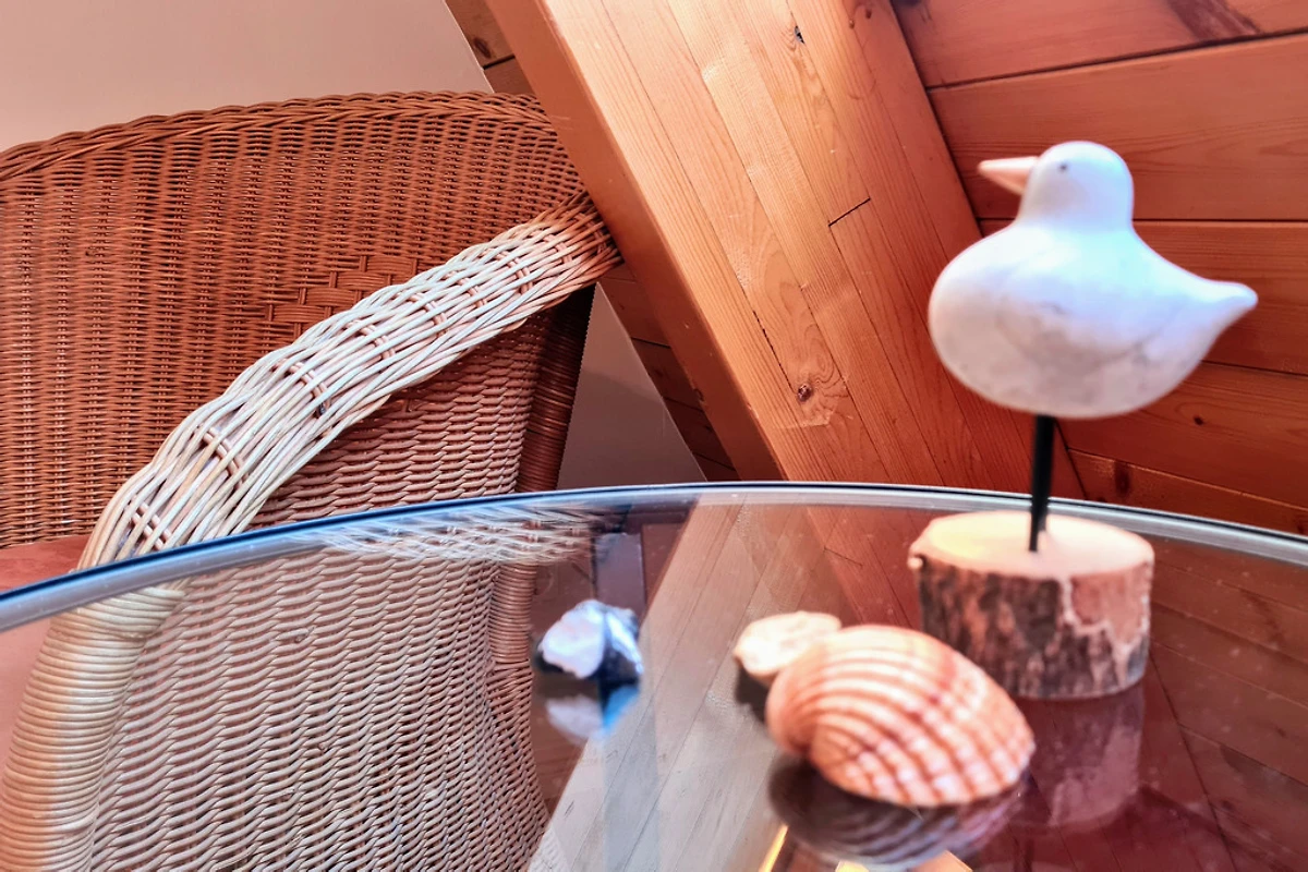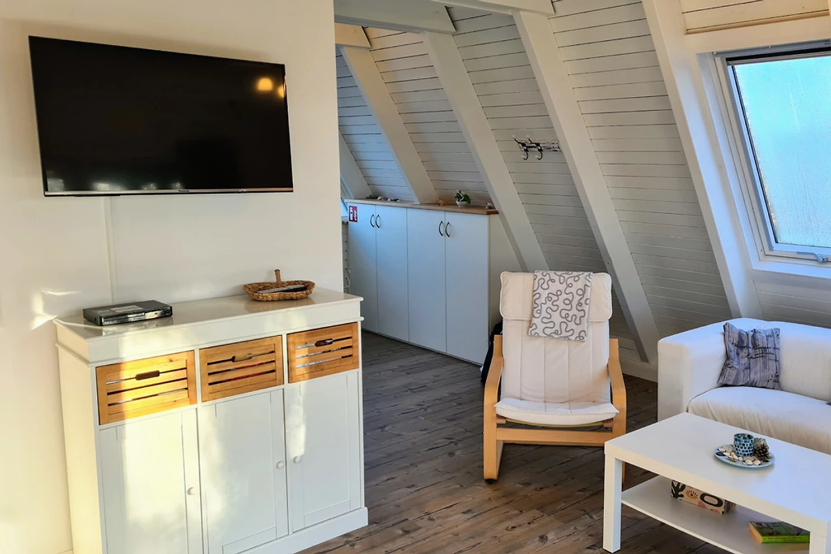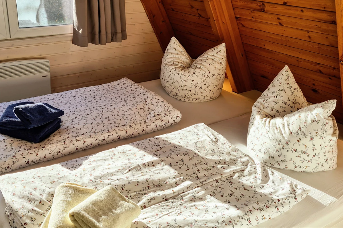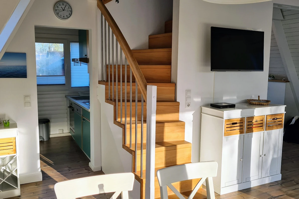 Vom Wohnbereich aus führt eine Treppe in die obere Etage. Hier erwartet Sie ein kleiner Bereich, um sich mit einem guten Buch zurückzuziehen und die beiden Schlafzimmer, eines mit Doppelbett und eines mit zwei Einzelbetten. Ein Bettchen für unsere kleinen Gäste bis 2,5 Jahre kann bei Bedarf aufgestellt werden.