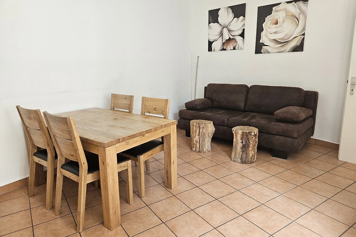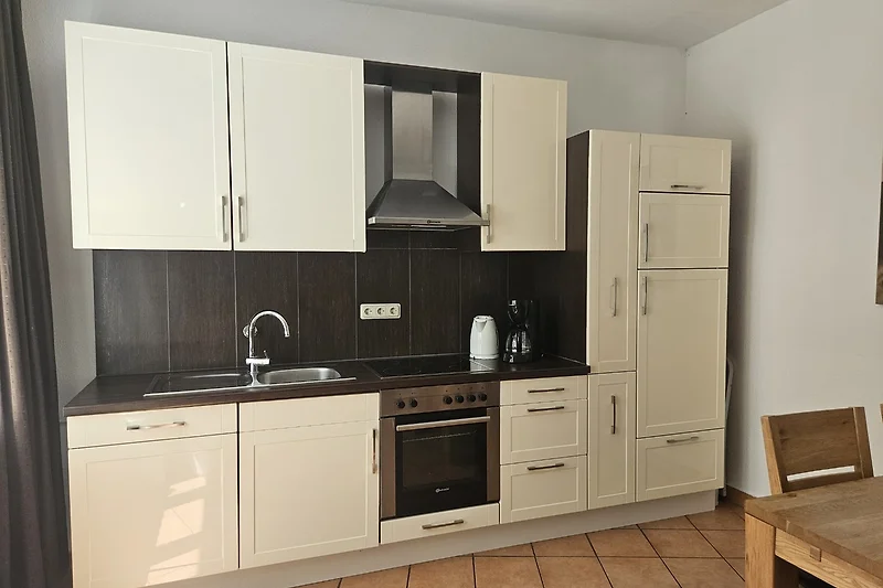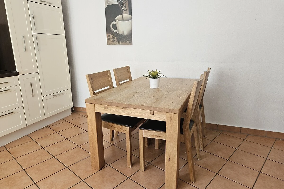 Die Wohnküche ist mit einer Einbauküche (Ceran-Feld Herd, Spülmaschine, Kühlschrank, Gefrierfach) ausgestattet. Esstisch für 4 Personen, Schlafcouch für 2 Personen. Fernseher