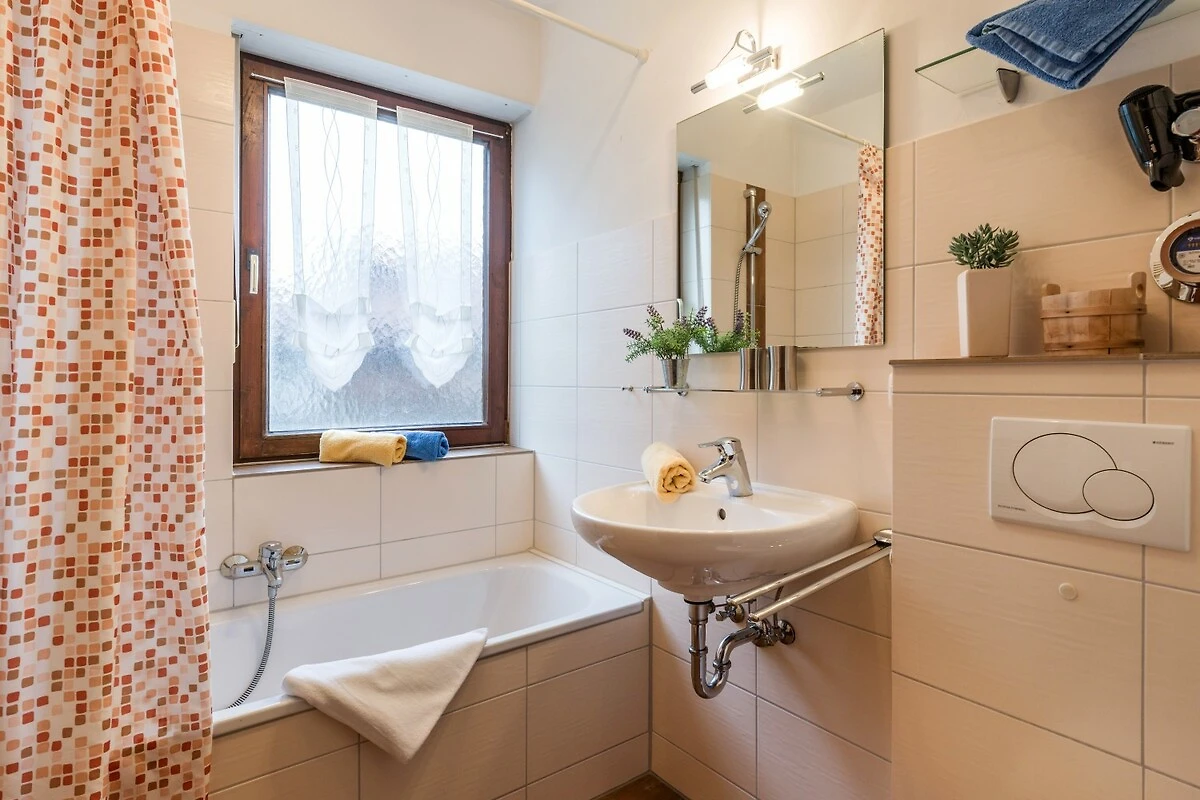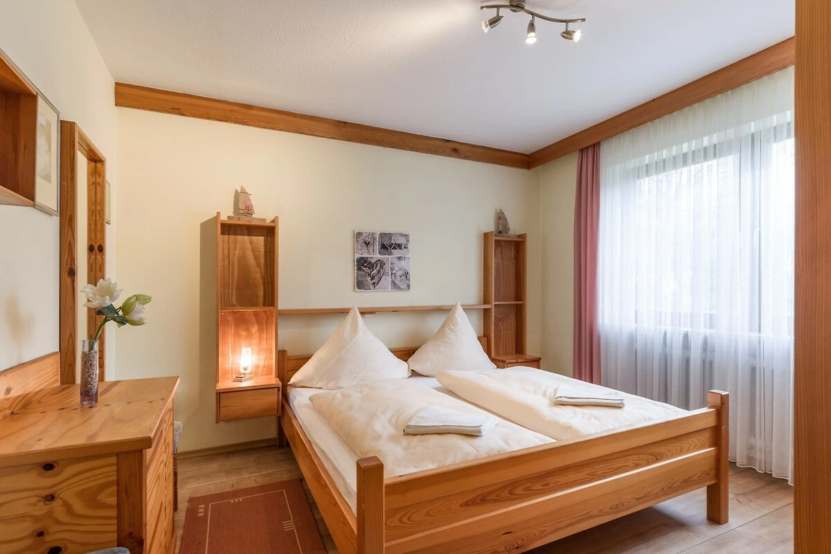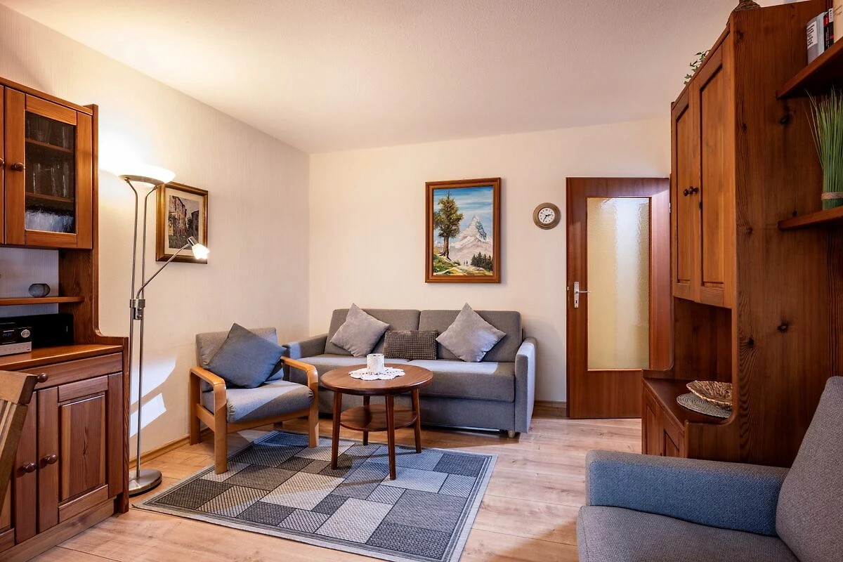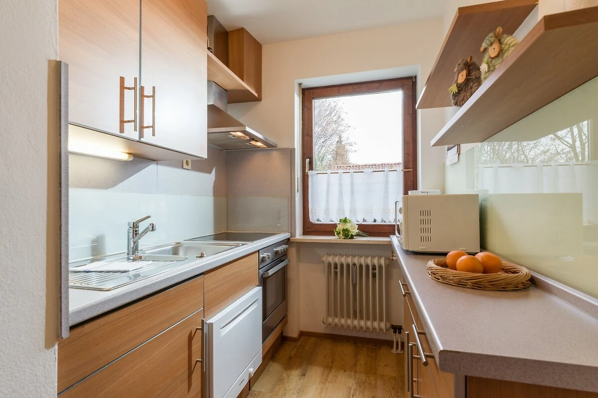 Gemütliche Zweizimmerwohnung mit Blick nach Süden auf das Kaisergebirge (56 qm, 2 bis 4 Personen) mit neuer gemütlicher Eckbank und einer Schlafcouch im Wohnzimmer. Das Schlafzimmer hat ein Doppelbett und einen Kleiderschrank. Das Bad ist mit WC und Wanne ausgestattet. Die Küche ist mit einem 4 Plattenherd, Backofen, Kühlschrank, Mikrowelle, Kaffeemaschine und Toaster sowie alle nötigen Kochutensilien ausgestattet.