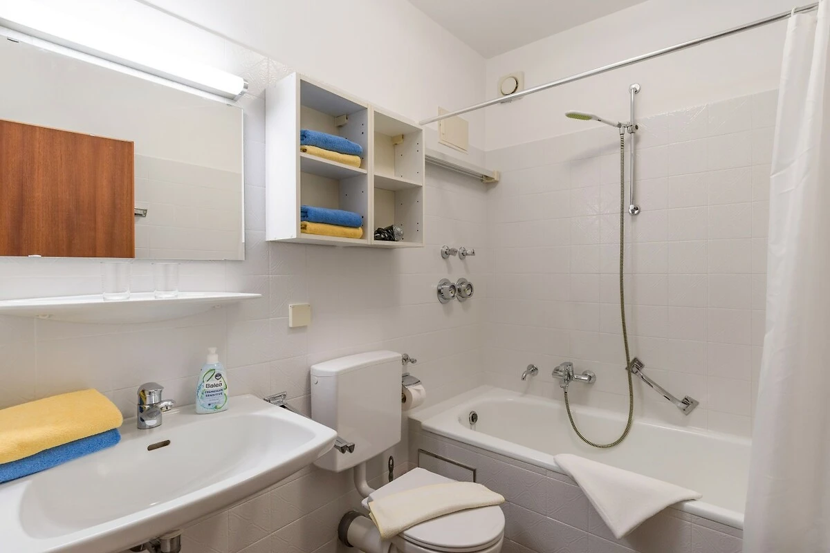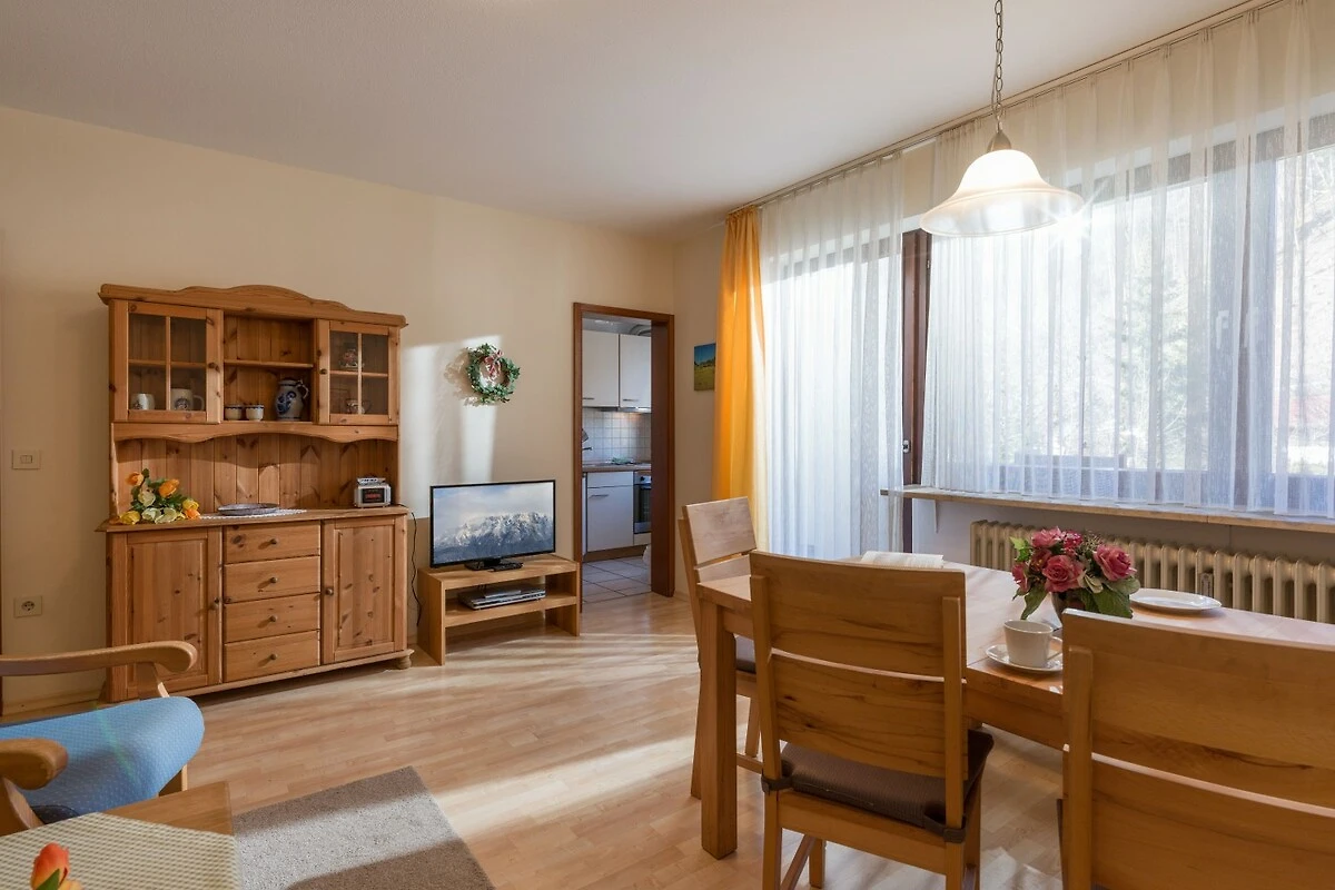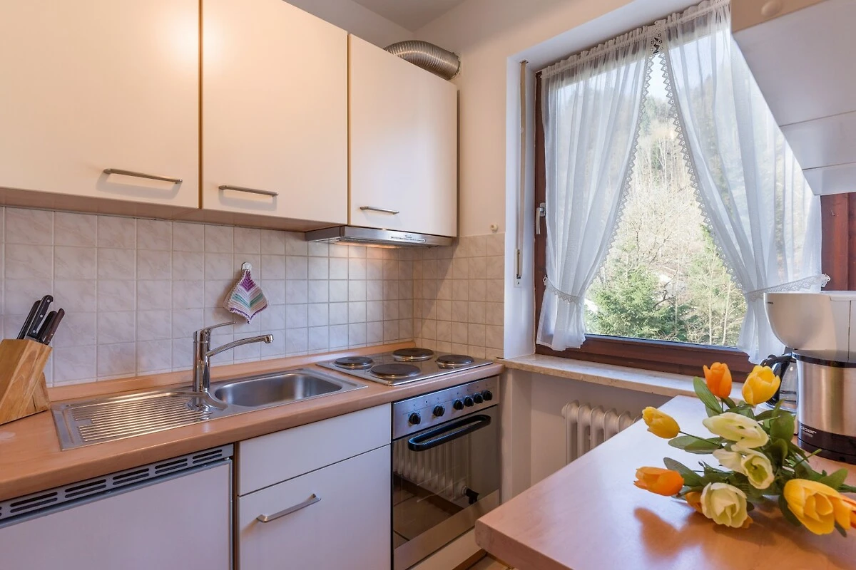 Freundlich eingerichtete Ferienwohnung im 1. Stock mit separater Küche und Bad mit Badewanne. Das Schlafzimmer mit einem Doppelbett und einem Stockbett,Der helle Wohraum mit gemütlicher Essecke. Die Wohnung bietet Platz für 2 oder oder eine kleine Familie. Das Wohnzimmer ist mit einer Ausziehcouch für 2 Pers und einem Esstisch für 5 Pers. ausgestattet. Der Balkon lädt nach einem ereignisreichen Tag zum Sitzen im Freien ein. Die Küche ist mit einem Backofen, Kühlschrank und einem 4- Plattenherd, Kaffeemaschine, Toaster, Wasserkocher und Küchenuntesilien ausgestattet.